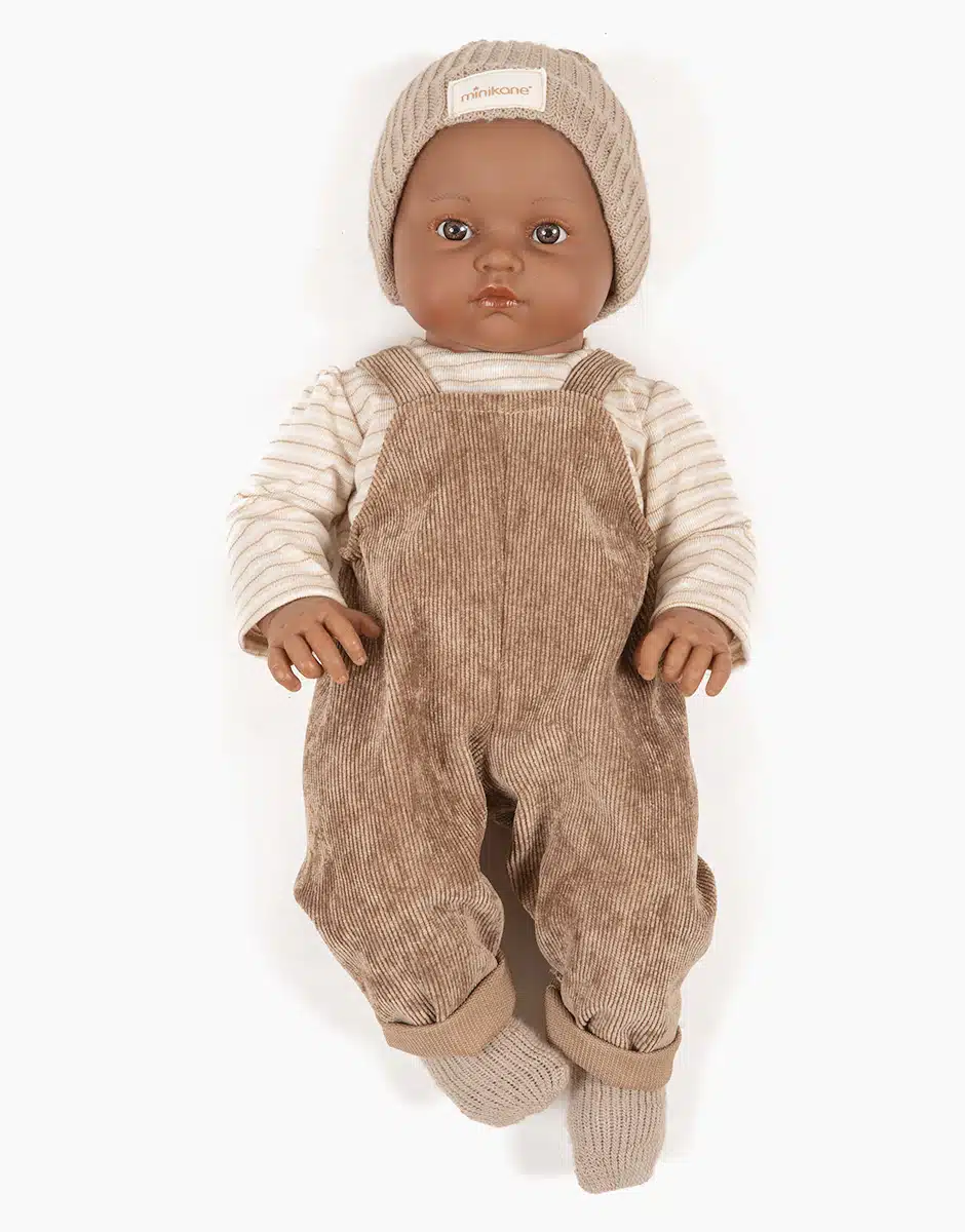 Lalka Bambinis, Augustun  Minikane o długości 47 cm, ubrana w aksamitny kombinezon, koszulkę z długim rękawem, czapkę oraz cieple skarpety.