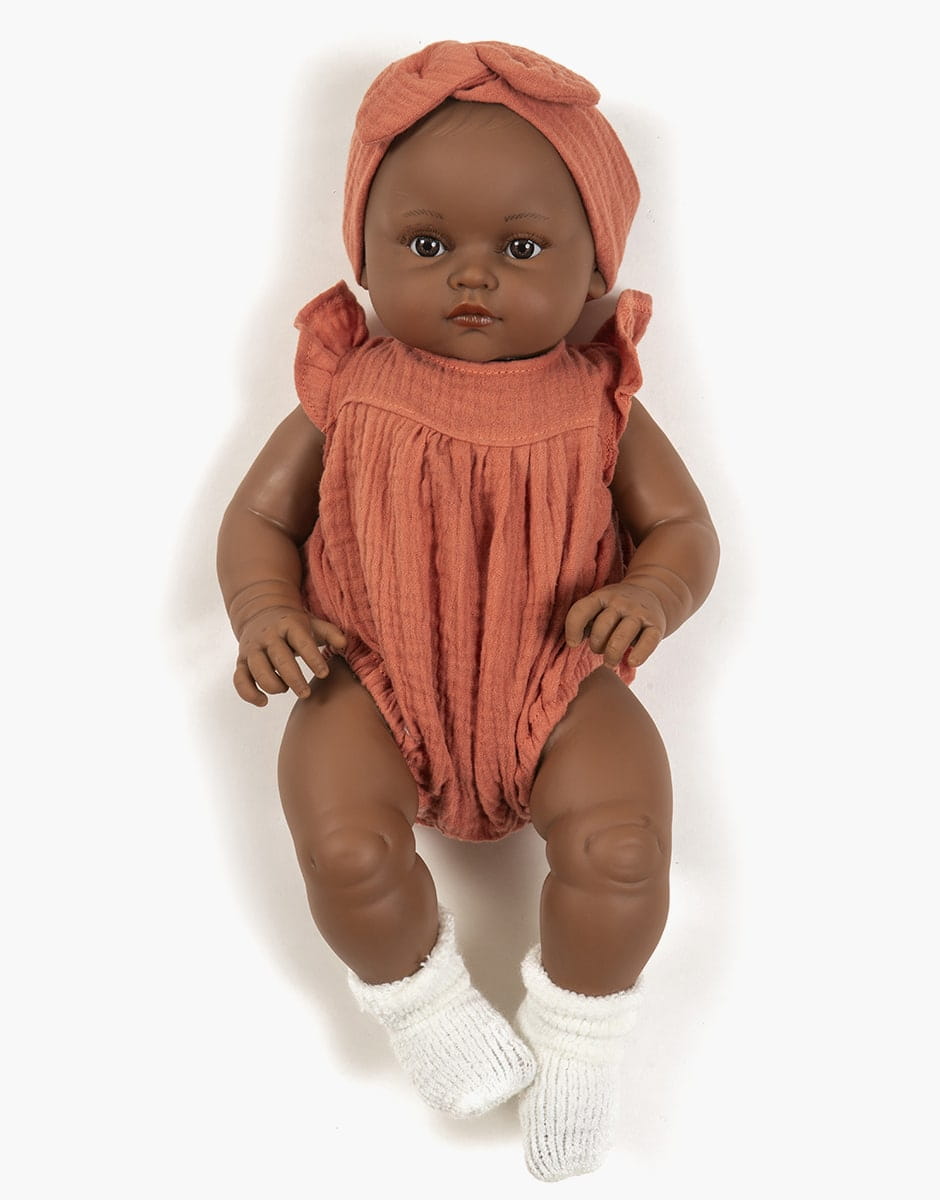 Lalka Bambinis Minikane o długości 47 cm, ubrana w śpioszki i opaskę na głowę z tkaniny muślinowej oraz skarpetek w kolorze beżowym.