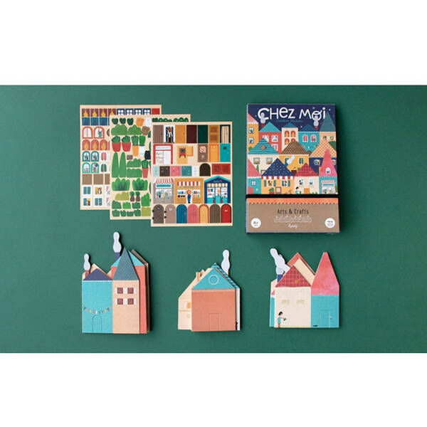 Kreatywny zestaw do zabawy Arts&Crafts zawiera 3 rozkładane karty domów i 185 usuwalnych naklejek.
