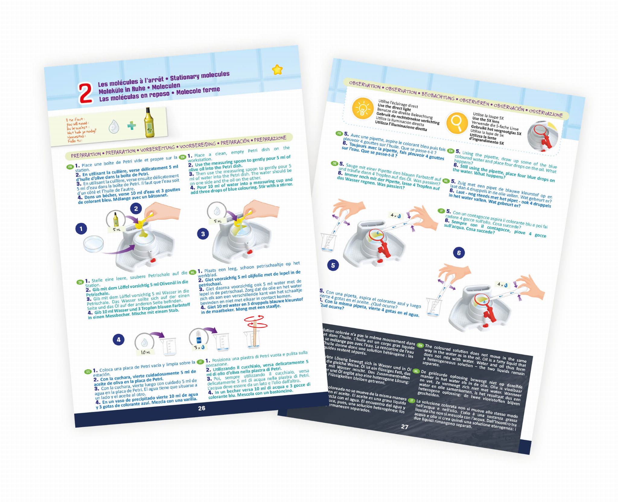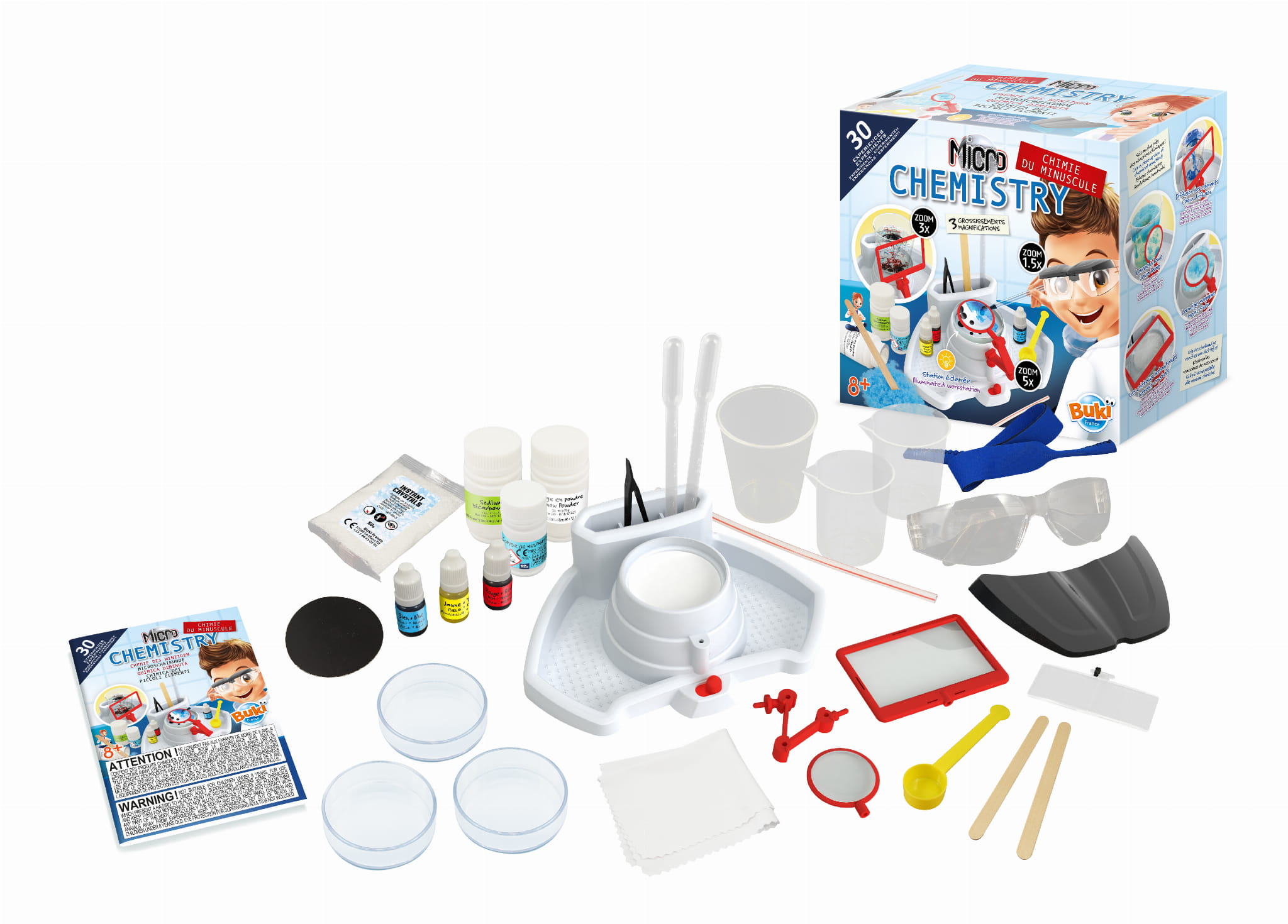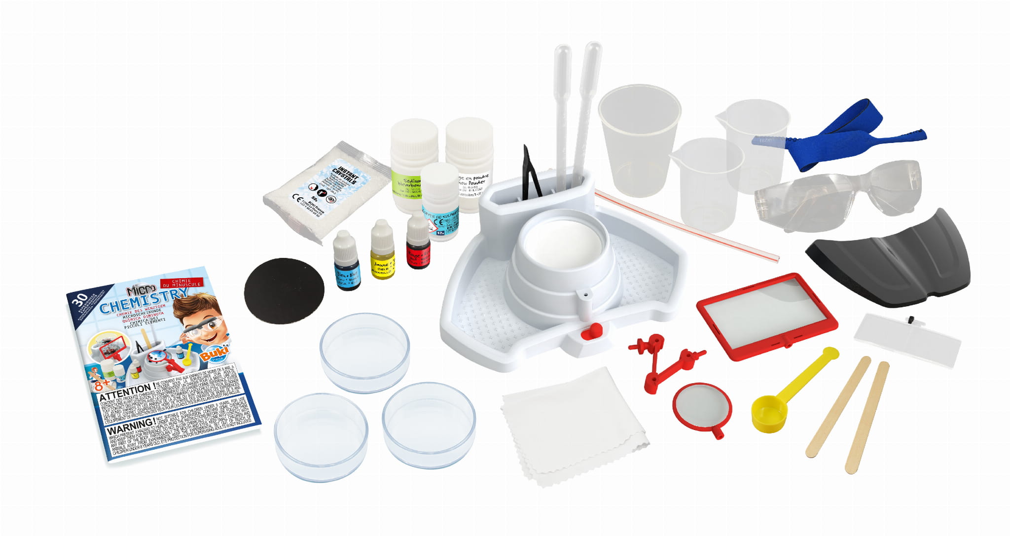 Zestaw do wykonania 30 eksperymentów i zanurzenia się w mikroskopijnym świecie: wytrącanie kryształów, polimeryzacja, reakcja kwasowo-zasadowa itp.