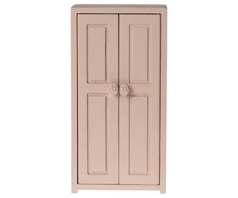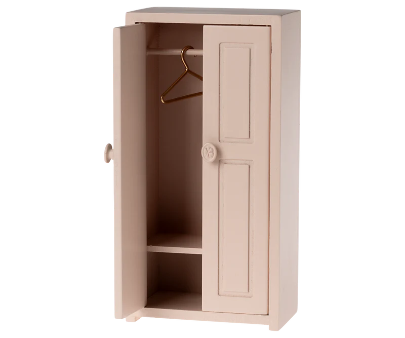 Mała szafka pomaga rodzinie myszy uporządkować garderobę. Do szafy dołączone są trzy złote wieszaki.