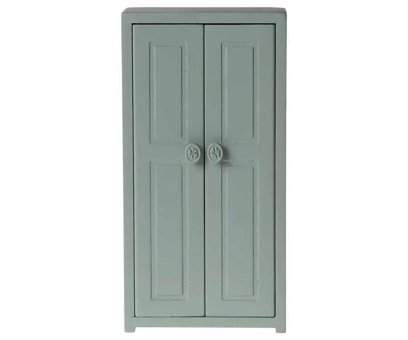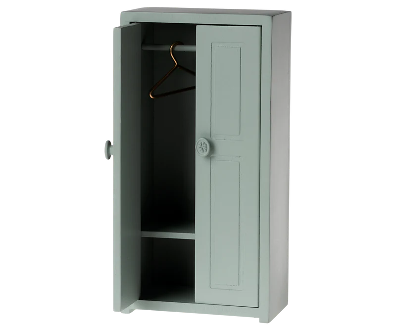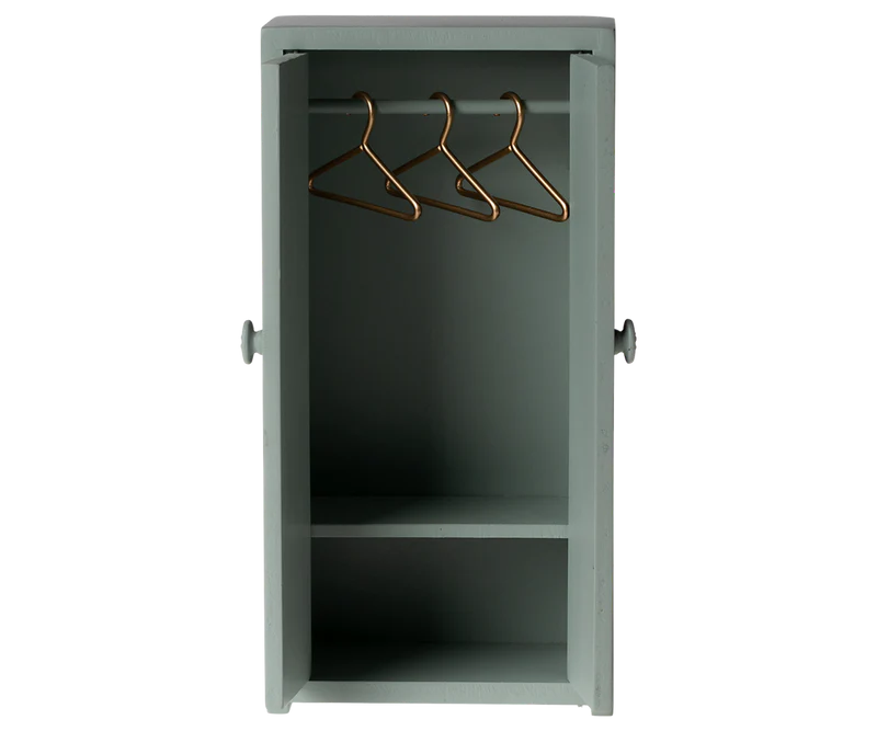 Mała szafka pomaga rodzinie myszy uporządkować garderobę. Do szafy dołączone są trzy złote wieszaki.