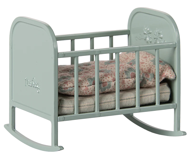 Pięknie zaprojektowana kołyska z metalu z miękkim śpiworem i materacem w środku. Kołyska ma małe wytłoczenie kwiatka na wezgłowiu i zaokrąglone nogi, dzięki czemu można kołysać maluchy do snu.