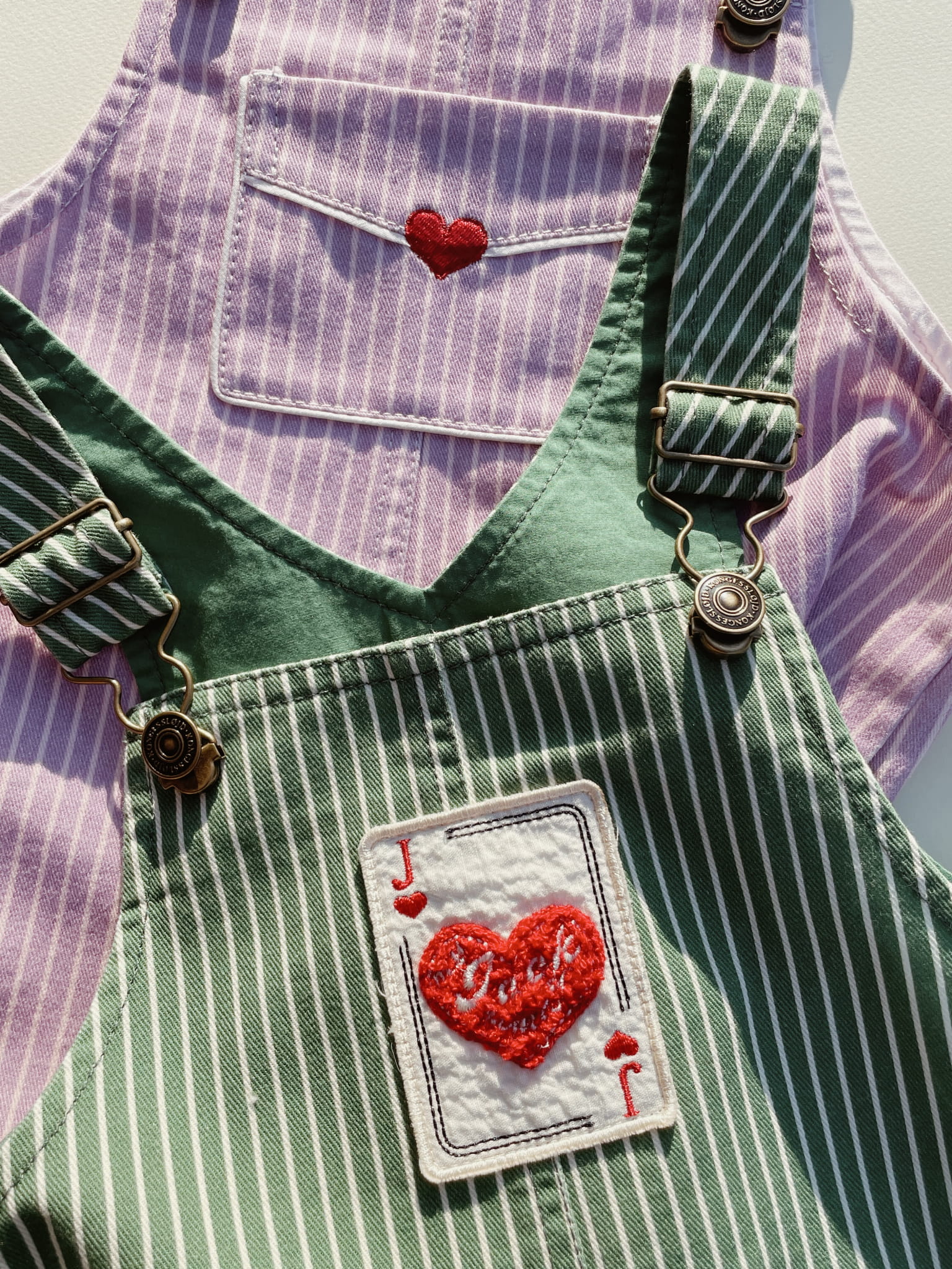 Kombinezon wykonany z miękkiej organicznej bawełny skośnej z ozdobną kieszenią z przodu w kształcie listu miłosnego, ozdobioną serduszkiem.