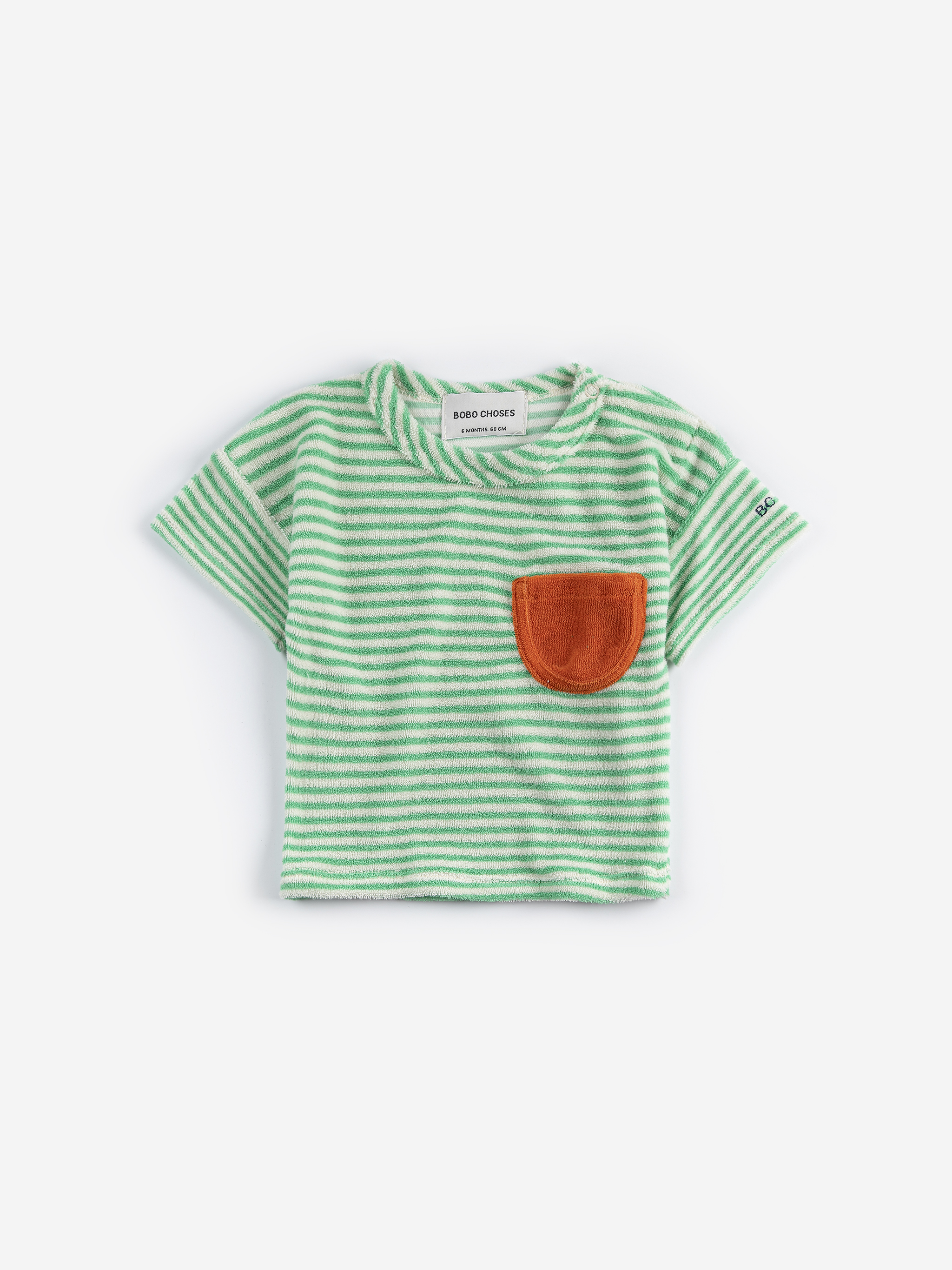 Koszulka Green Stripes - Green od Bobo Choses. Zielony T-shirt w jasne paski. Zaprojektowany z krótkimi rękawami, zapięciem na guziki na ramieniu, haftem, okrągłym dekoltem, kieszenią naszywaną i luźnym krojem. Wyprodukowana w Hiszpanii.