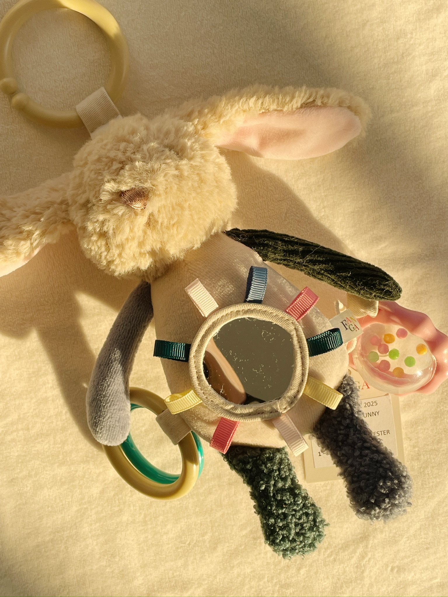 Peluche został zaprojektowany z wykorzystaniem różnych faktur, które stymulują zmysły, funkcji grzechotania, lusterka i łatwych do chwycenia uchwytów.