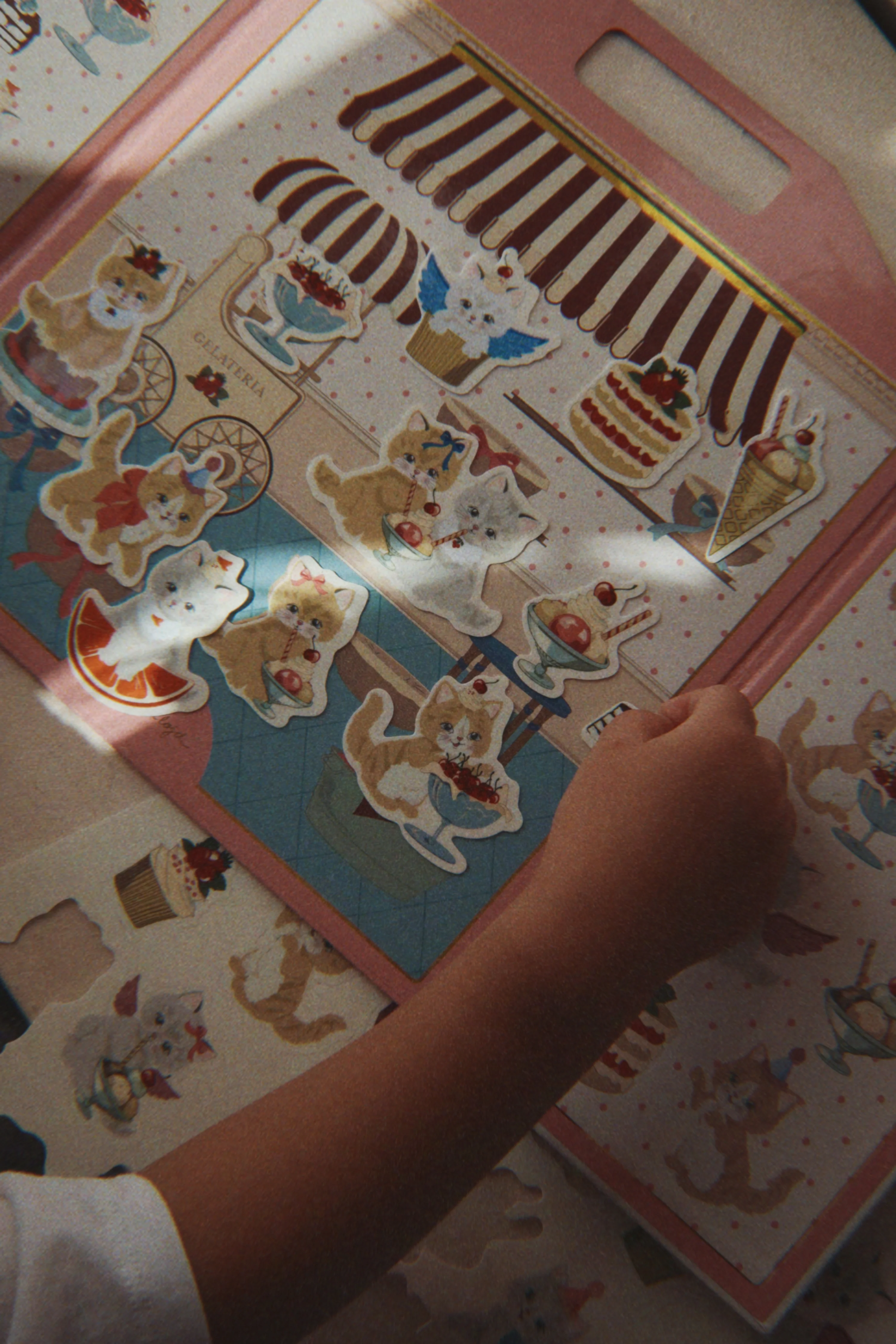 Magiczna książeczka z naklejkami, która zaprasza do słodkiej małej lodziarni Kitty Gelateria.