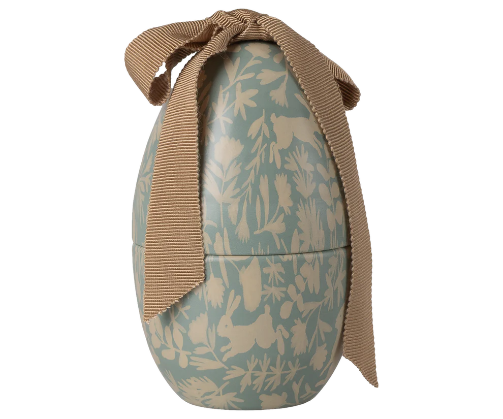 Jajko wielkanocne Maileg ma piękny, nowy nadruk na całej powierzchni. Przyjrzyj się uważnie nadrukowi i spróbuj znaleźć różne zwierzątka. Jajko ma dużą, miękką kokardę na górze, która nadaje mu ekskluzywny wygląd.
