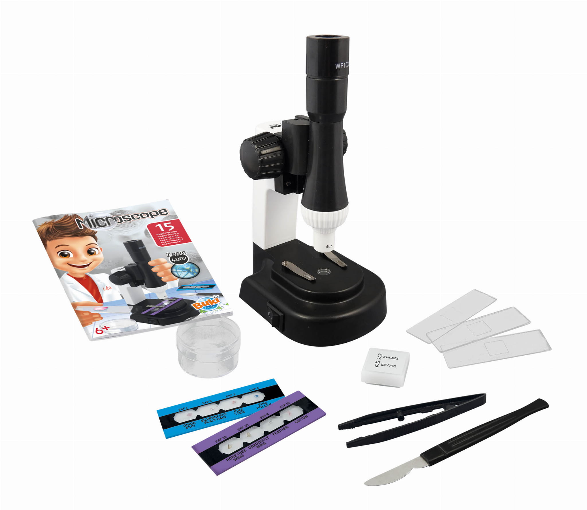 Podstawa z metalu, baterie (2xAA) nie są załączone. Mikroskop posiada wbudowane podświetlenie LED. Zestaw zawiera książeczkę do przeprowadzenia 15 doświadczeń aby zbierać obiekty badań, przygotowywać slajdy oraz badać świat pod mikroskopem.
