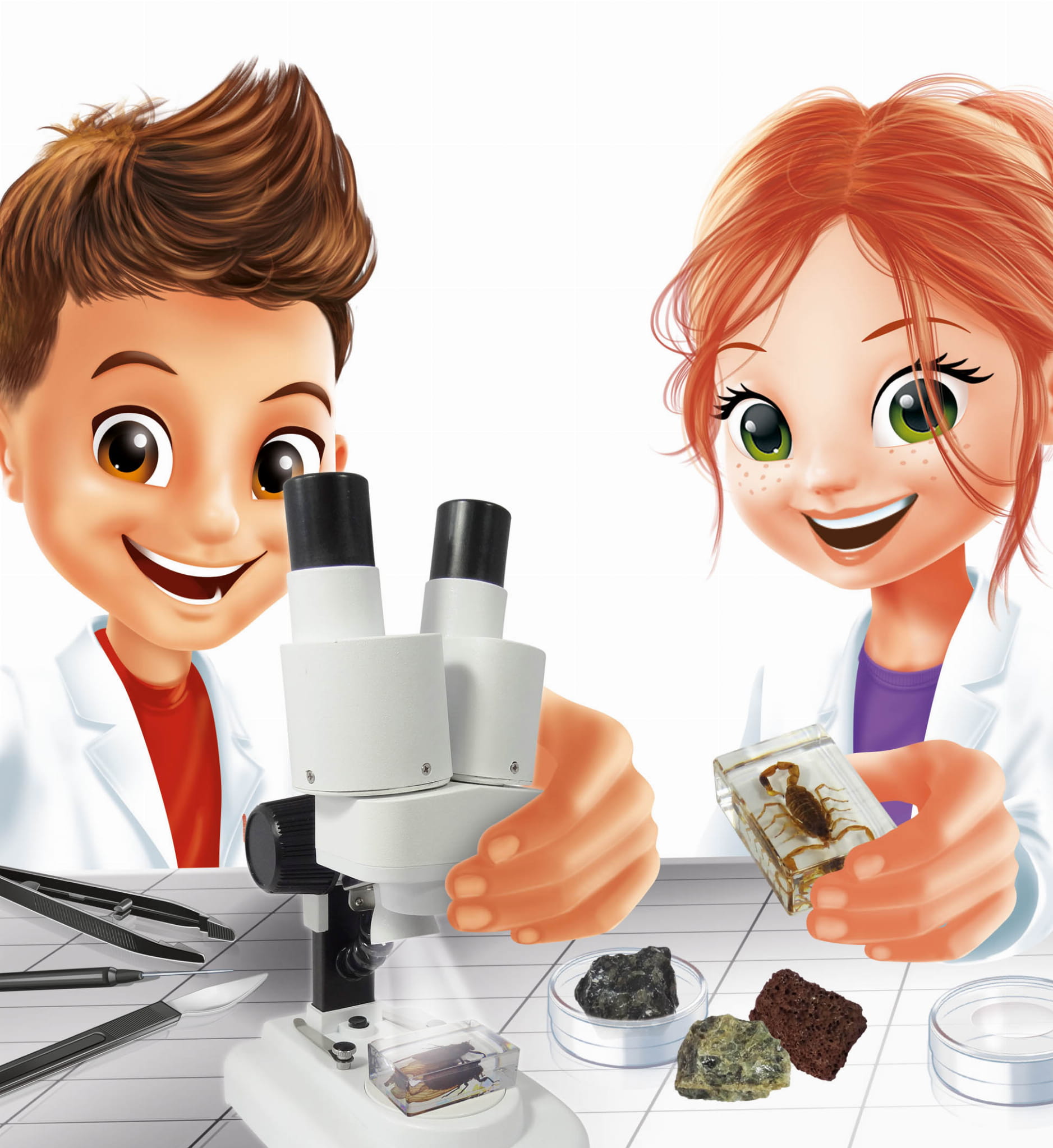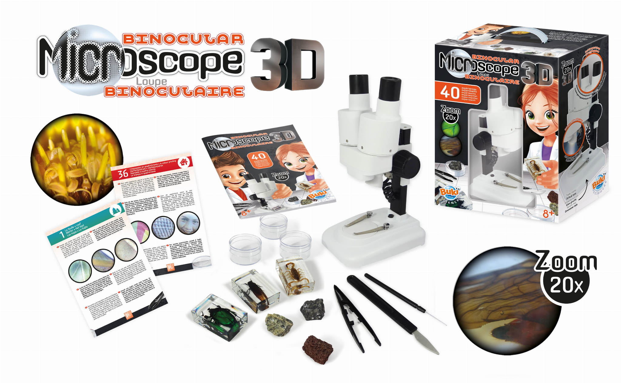 Podstawa z metalu, baterie (2xAA) nie są załączone. Mikroskop posiada wbudowane podświetlenie LED. Zestaw zawiera 3 próbki owadów oraz 3 rodzaje skał do obserwacji.