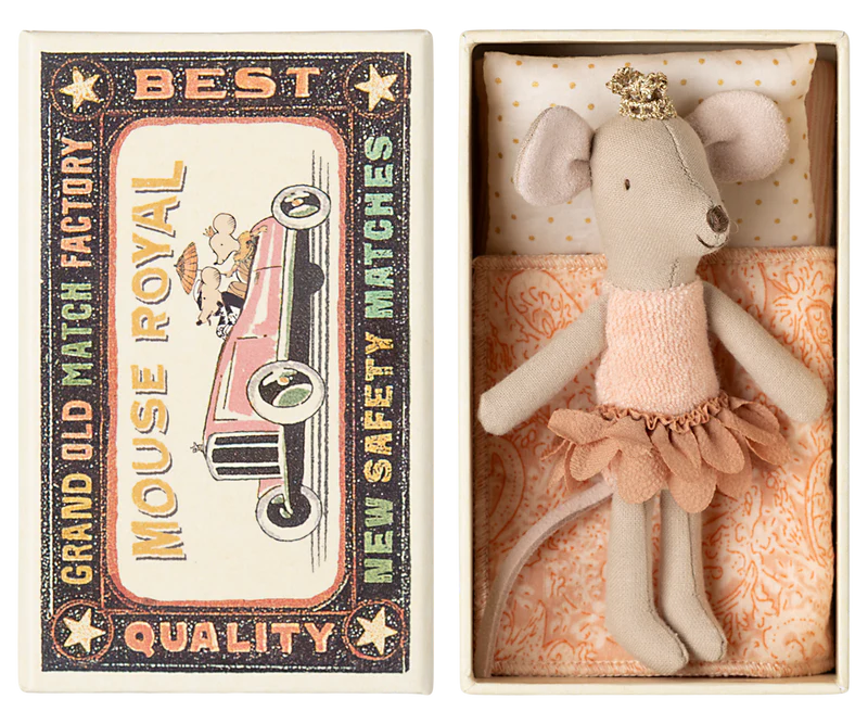 Ta piękna księżniczka jest gotowa na wiele godzin zabawy. Myszka śpi w małym pudełku zapałek. Ubrania i pościel wykonane są z miękkich tkanin z niepowtarzalnymi nadrukami i pięknymi kolorami. Pościel może różnić się kolorem