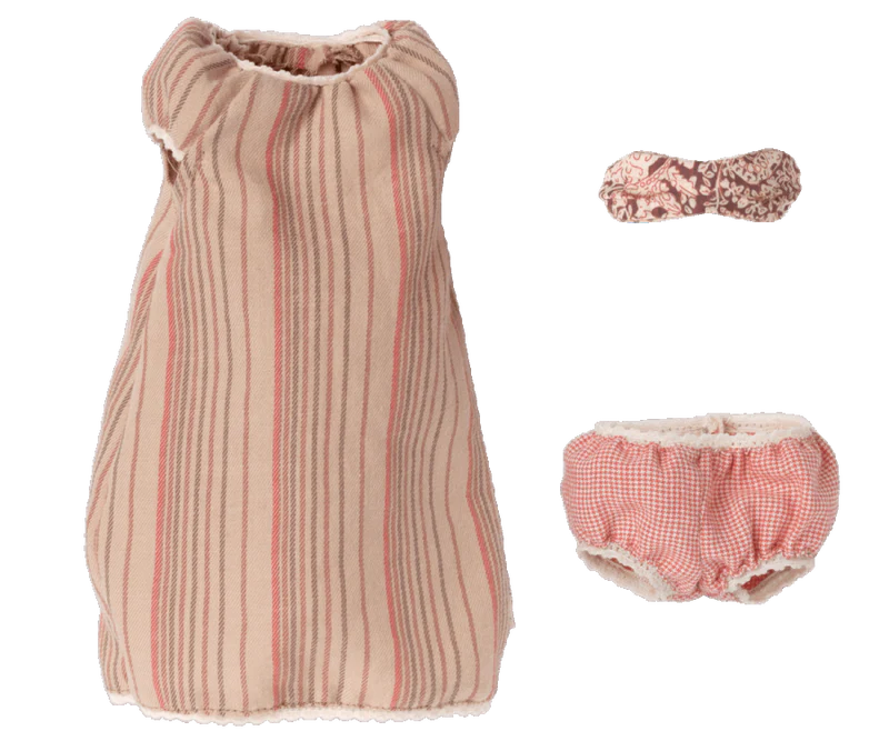 Średniej wielkości myszka ubrana jest w koszulę nocną i ma maskę do spania, która zapewnia spokojny sen.