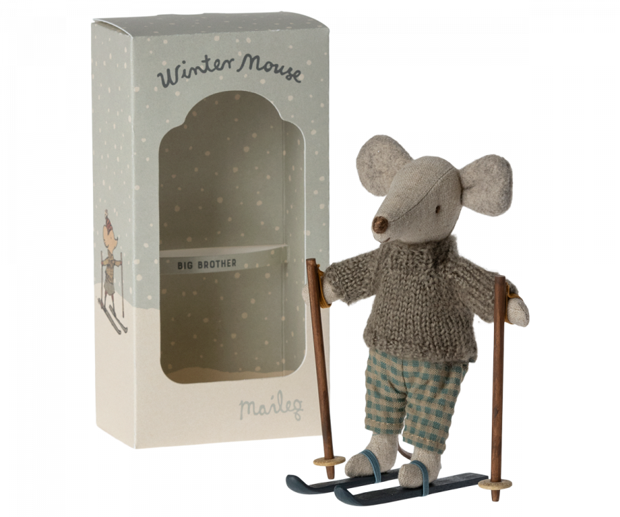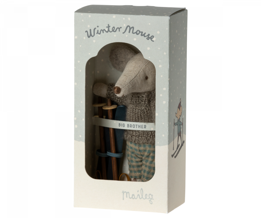 Mysz gotowa na wiele godzin zabawy na stoku podczas mroźnej zimy. Każdy zestaw zawiera ciepło ubraną mysz z parą nart i kijkami. Zabawnym detalem są uszy, które wyglądają tak, jakby mysz miała na sobie ocieplacze.