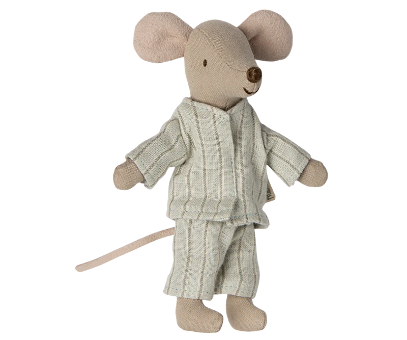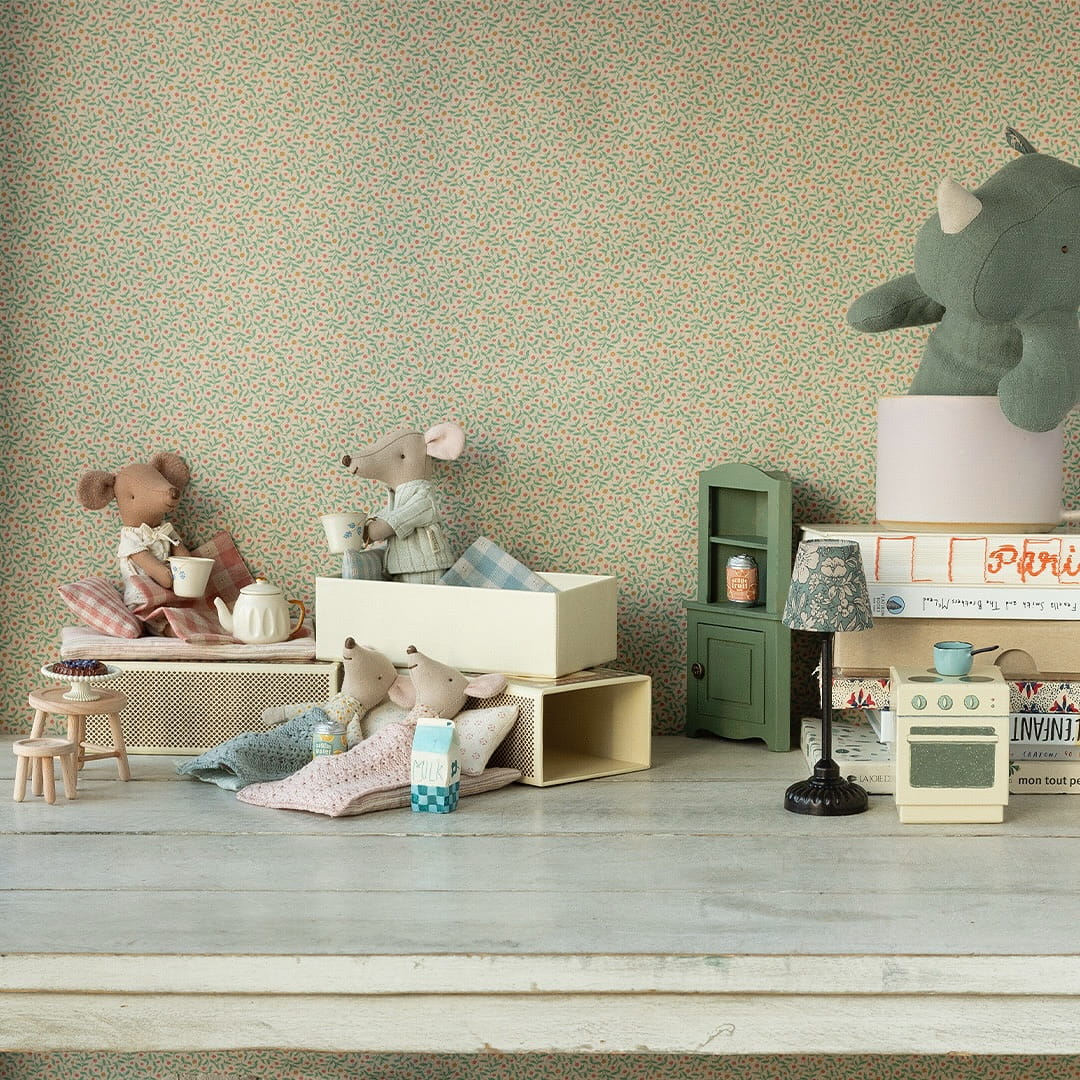 Myszka mieszka w pudełku po zapałkach, który wyposażony jest w kocyk w kratkę, poduszkę oraz materacyk. Ubrania i pościel mają niepowtarzalne nadruki i piękne kolory.