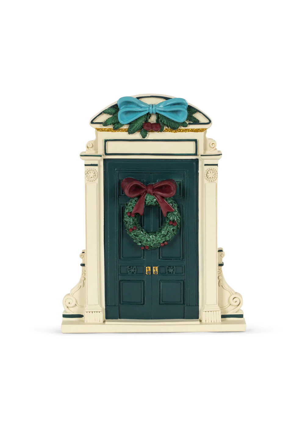 Zestaw zawiera drzwi, kota z ozdobną kokardą i świąteczną choinkę.