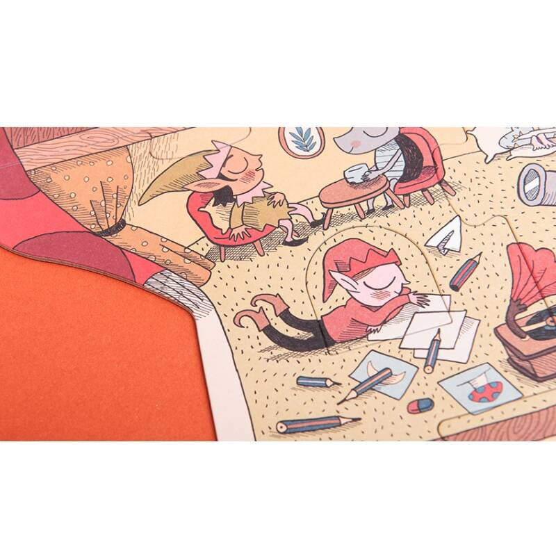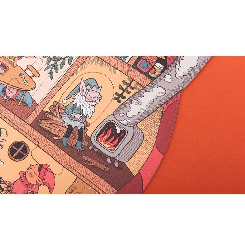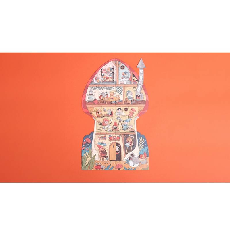 Z jednej strony układanki jest zewnętrzna część grzybka, a z drugiej strony dzieci układają jego wnętrze. Po ułozeniu dużych elementów domku grzybowego (10 puzzli) dziecko będzie mogło dopasować elementy do wnętrza domku (8 mniejszych puzzli), usypiając różne postacie, przyzwyczajając się jednocześnie do nawyku kładzenia się spać . Elementy są bardzo duże, dostosowane do małych rączek.