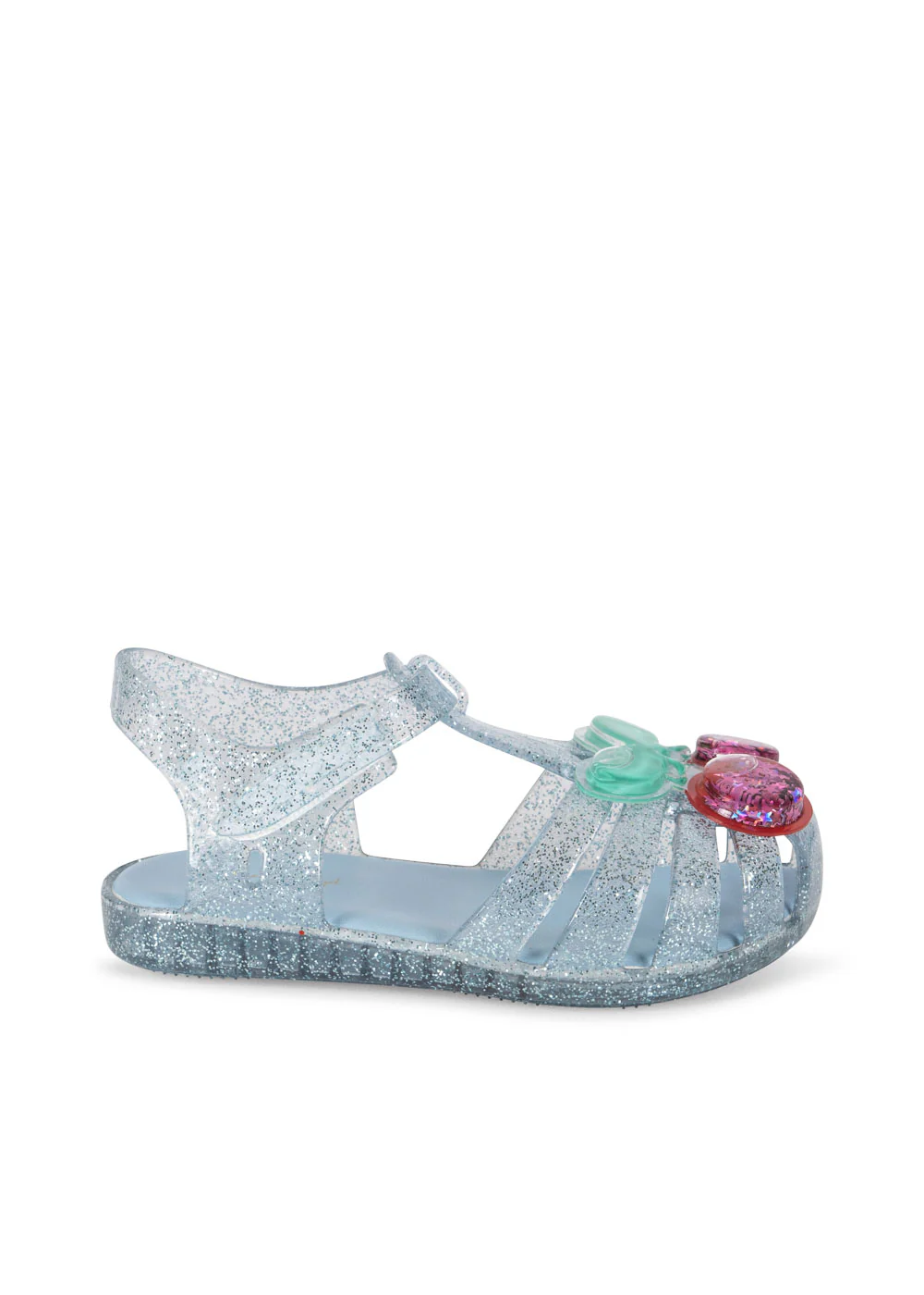 Błyszczące sandały plażowe wykonane z PVC z praktycznym zapięciem na rzep, które łatwo dopasować do małych rączek. Ozdobione charakterystyczną wisienką Konges Sløjd na czubku – delikatnie ściśnij, aby zobaczyć taniec brokatu.