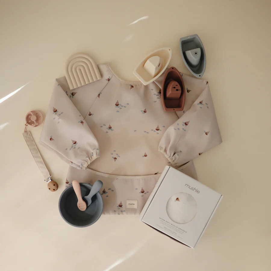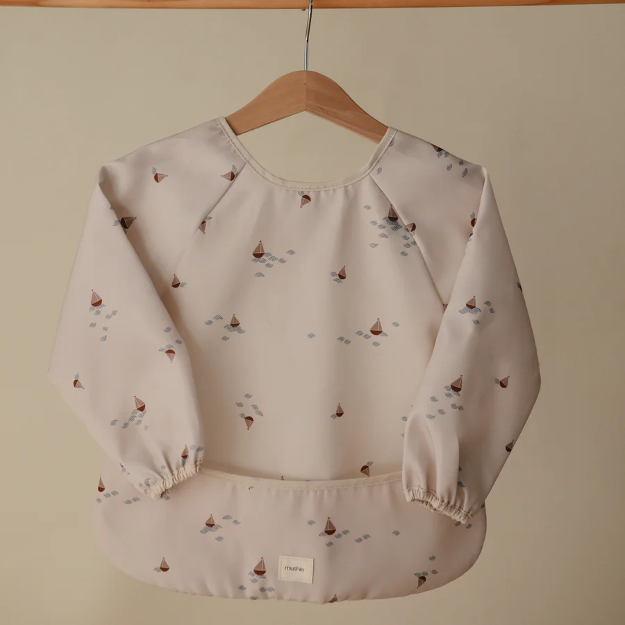 Wodoodporny Śliniak z długim rękawem Mushie, chroni ubranka dziecka podczas posiłków, projektów artystycznych, czy innych brudzących czynnościach. Szeroka kieszeń z łatwością złapie jedzenie, a śliniak w pełni ochroni zakryte ubranko. Dzięki wygodnemu zapięciu na rzep z tyłu szyi, jest on idealny dla maluchów w wieku od 6 do 24 miesięcy. Rodzice docenią łatwy do czyszczenia materiał, który można również bezpiecznie prać w pralce.