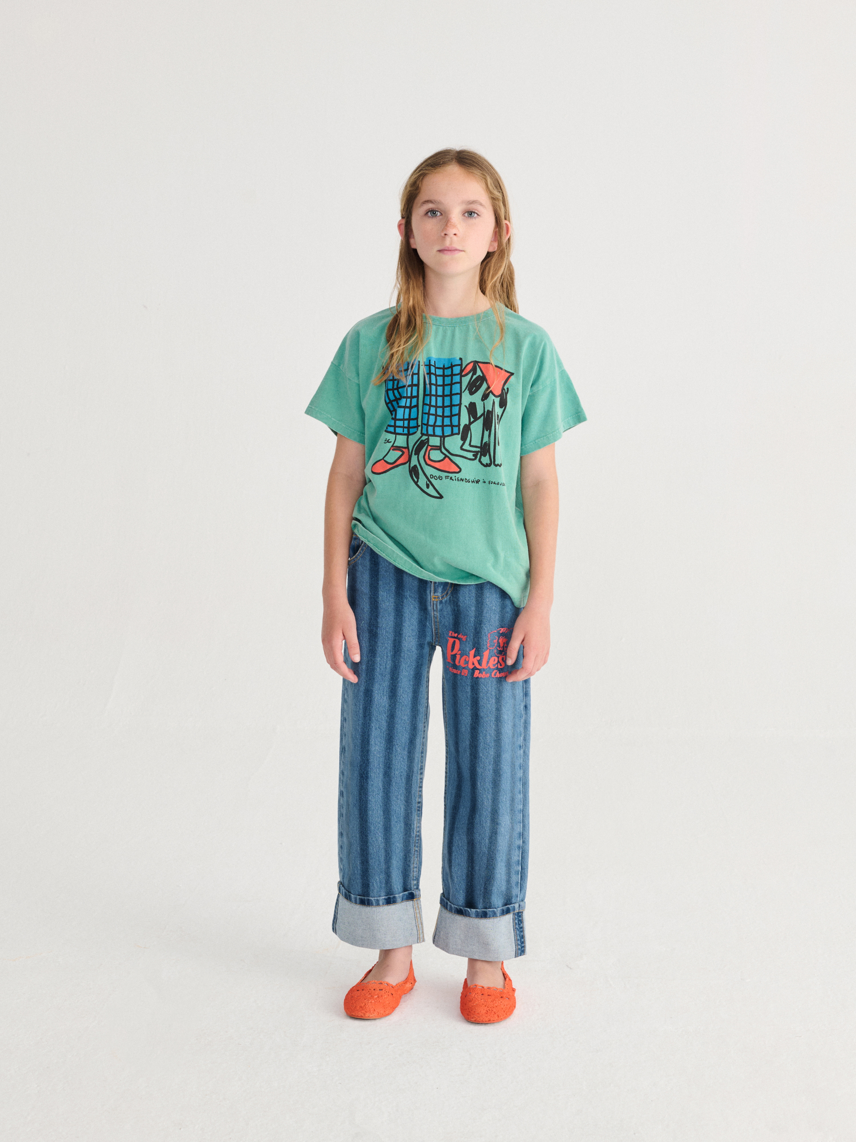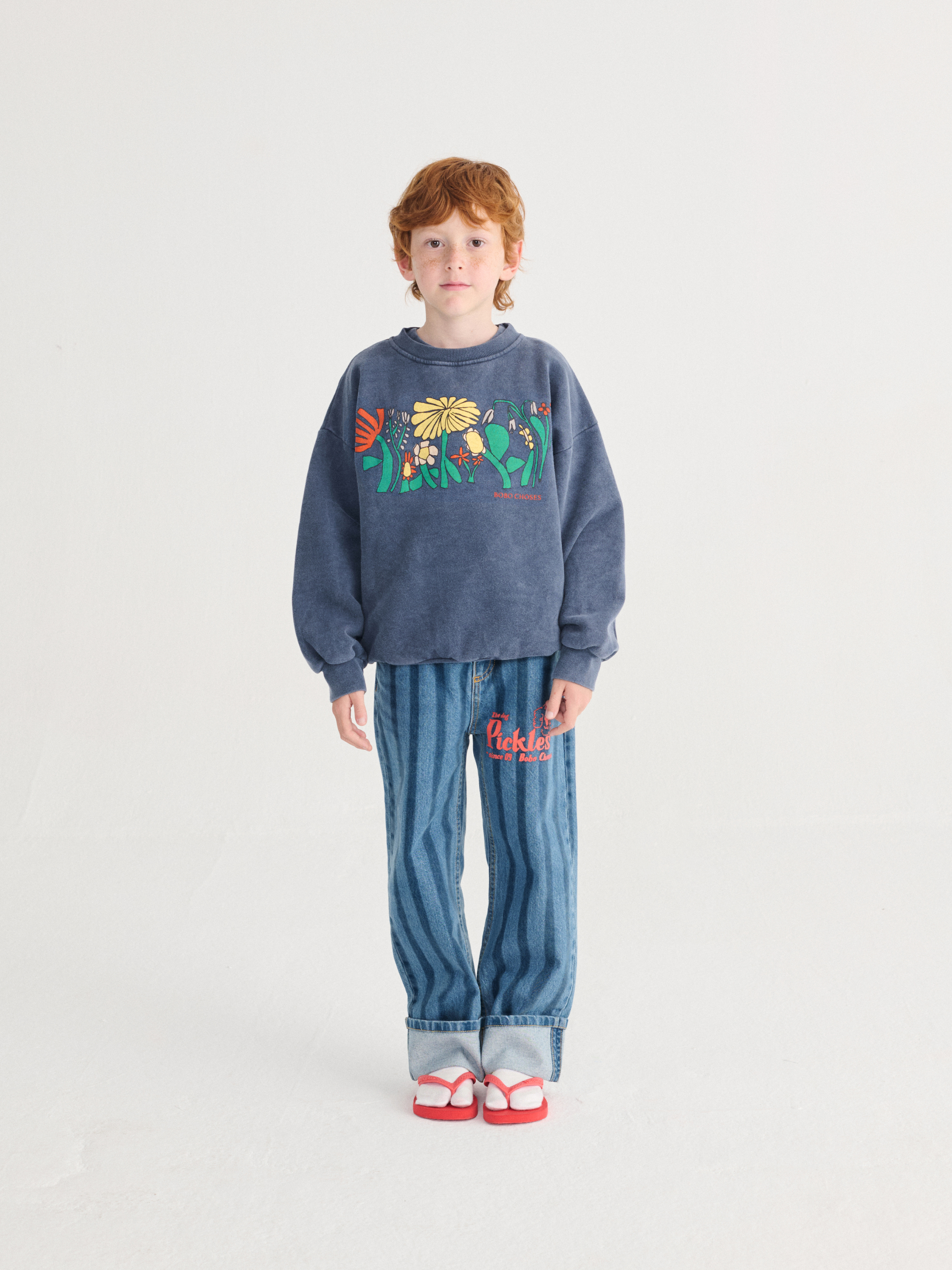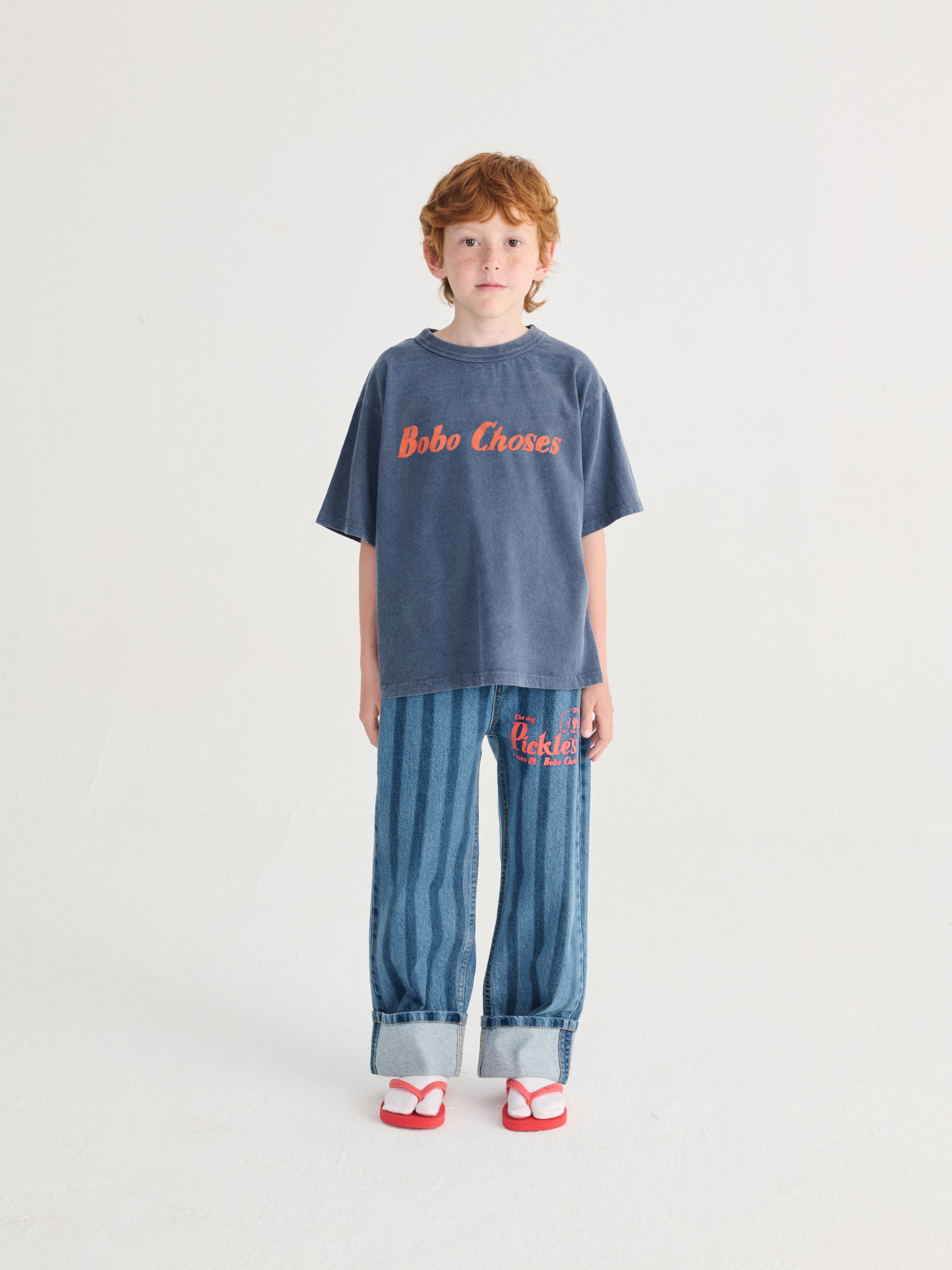 Spodnie Pickles The Dog Striped - Navy Blue od Bobo Choses. Granatowe spodnie. Zaprojektowane z regulowanym pasem, zapięciem na guziki z przodu, zamkiem błyskawicznym z przodu, prostym krojem, karczkiem z tyłu, szlufką na pasek, długim krojem, pięcioma kieszeniami, jeansowe i z podwiniętym dołem. Wyprodukowano w Hiszpanii.