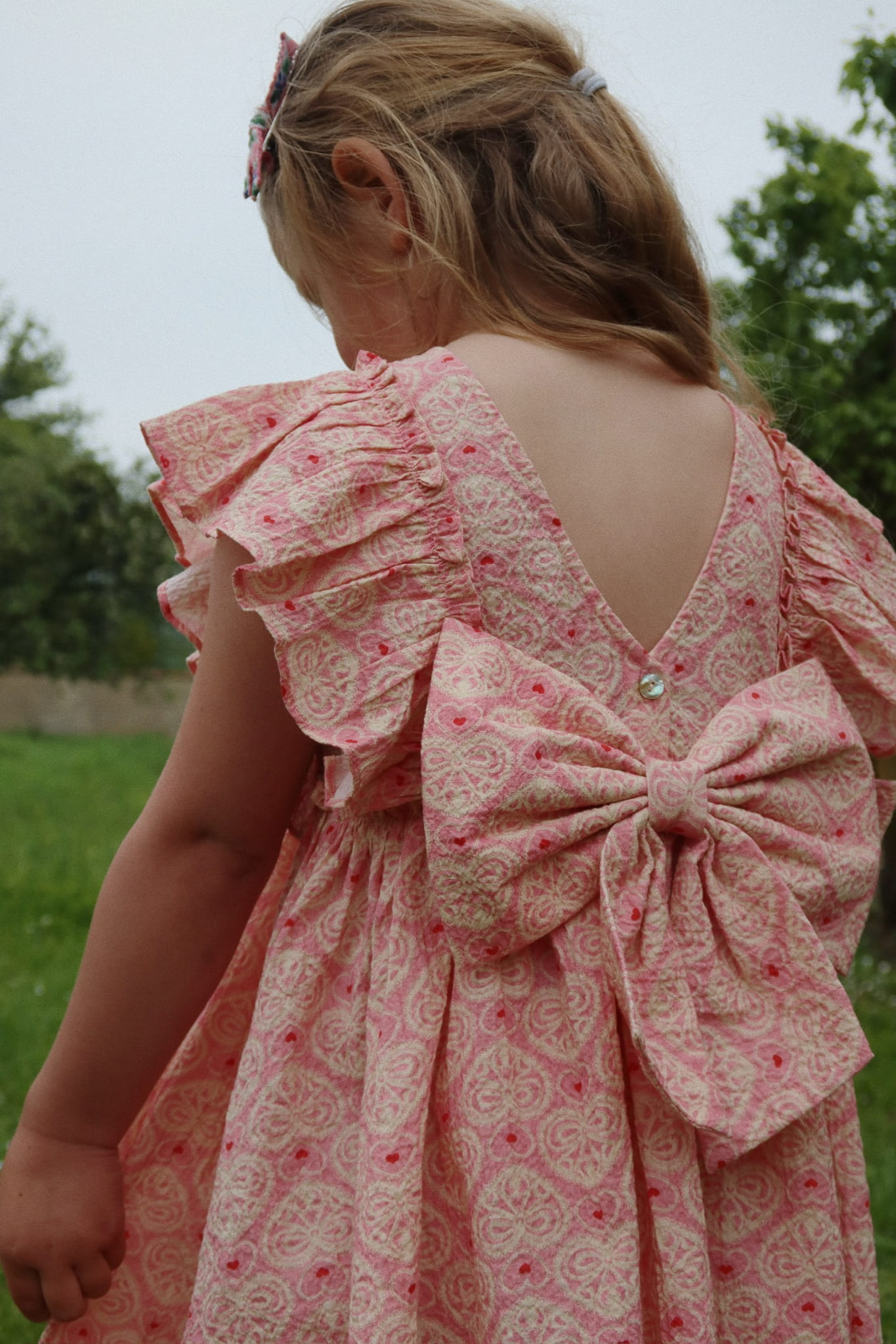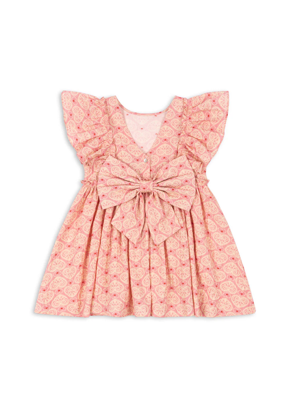 Miękka bawełniana sukienka z falbankami i kokardą z tyłu.