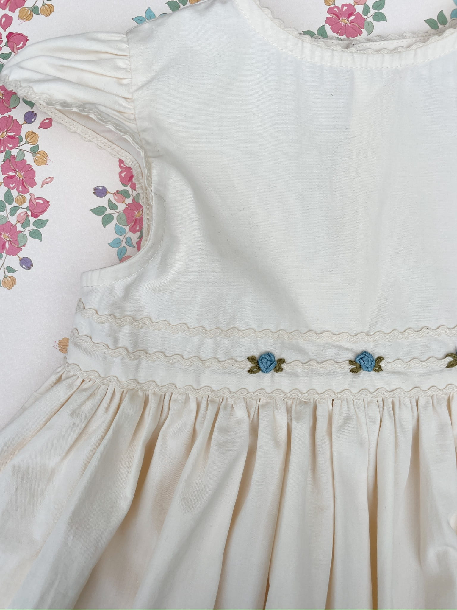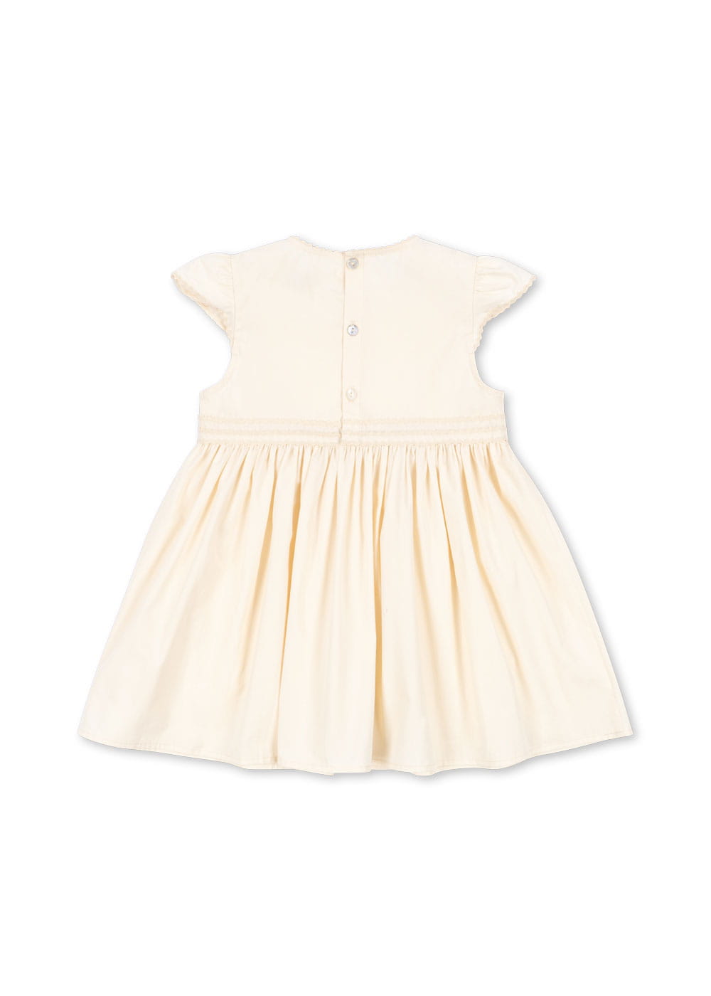 Klasyczna bawełniana sukienka podkreślająca sylwetkę, z podkreśloną talią, okrągłym dekoltem i krótkimi, lekko bufiastymi rękawami. Wykonane w 100% z bawełny organicznej GOTS, organiczne, certyfikowane przez CU1094701