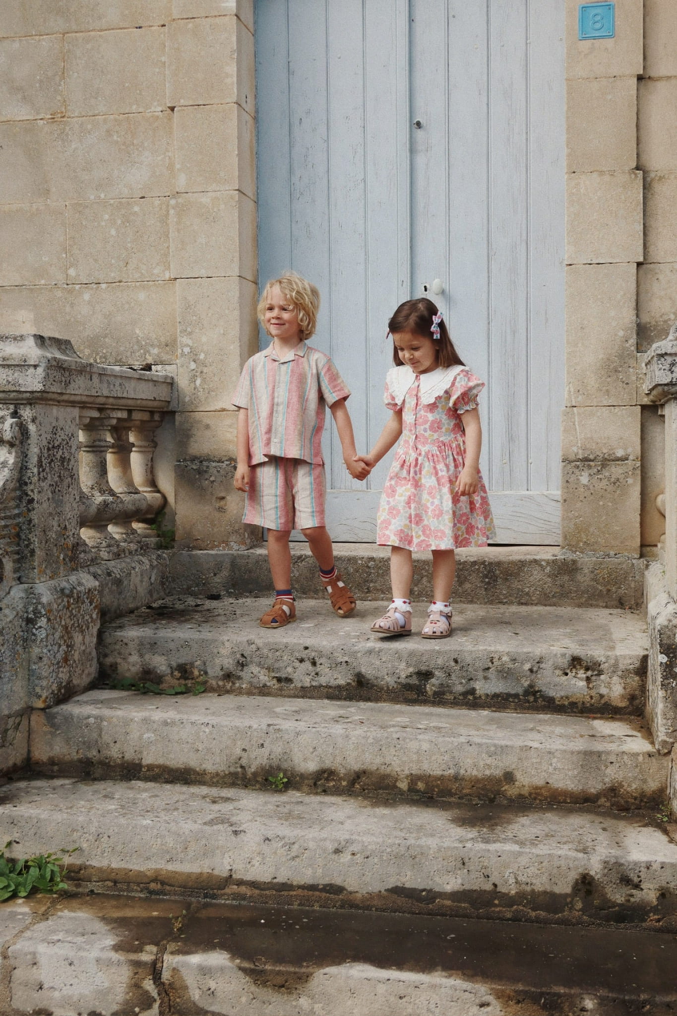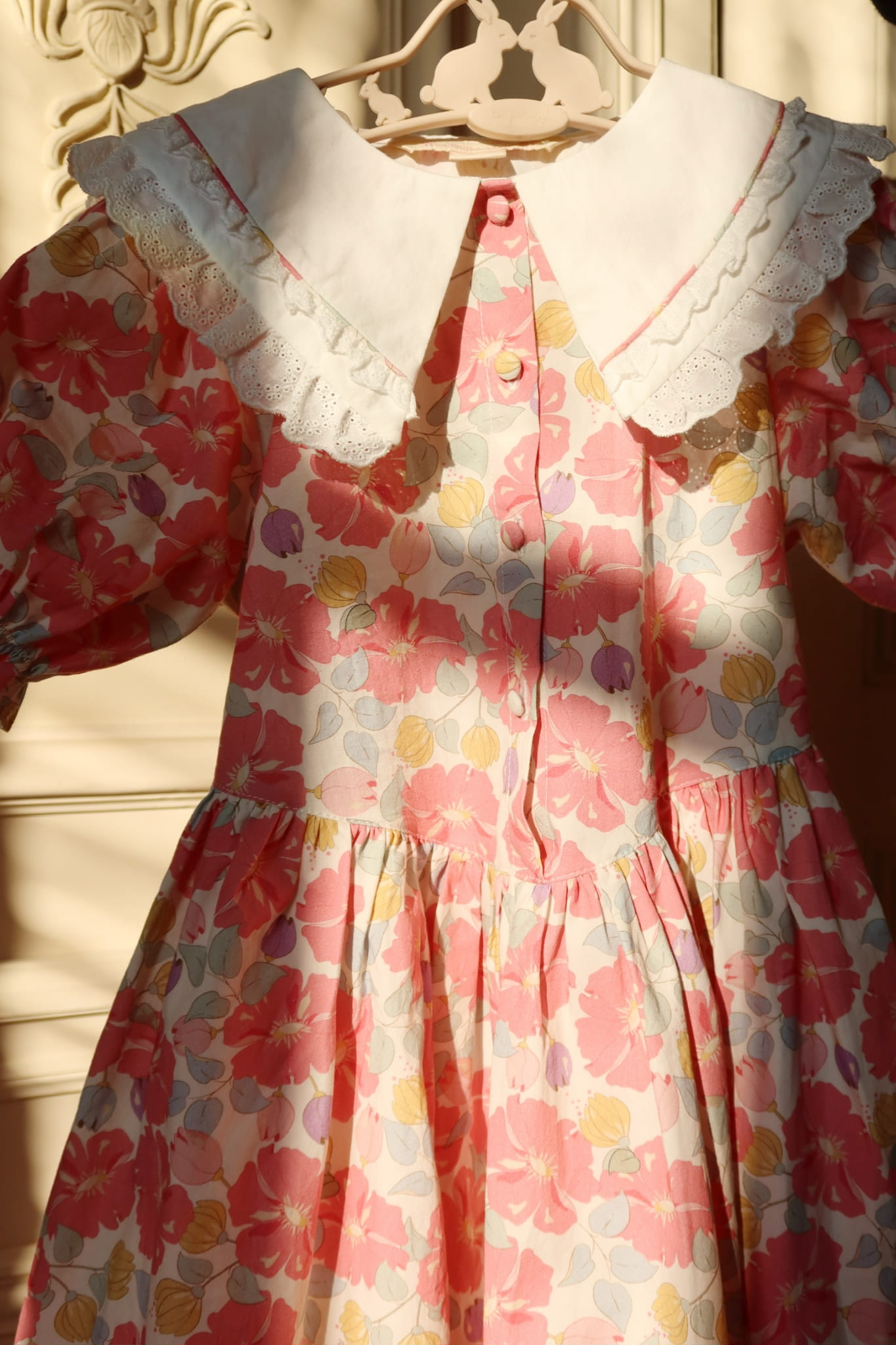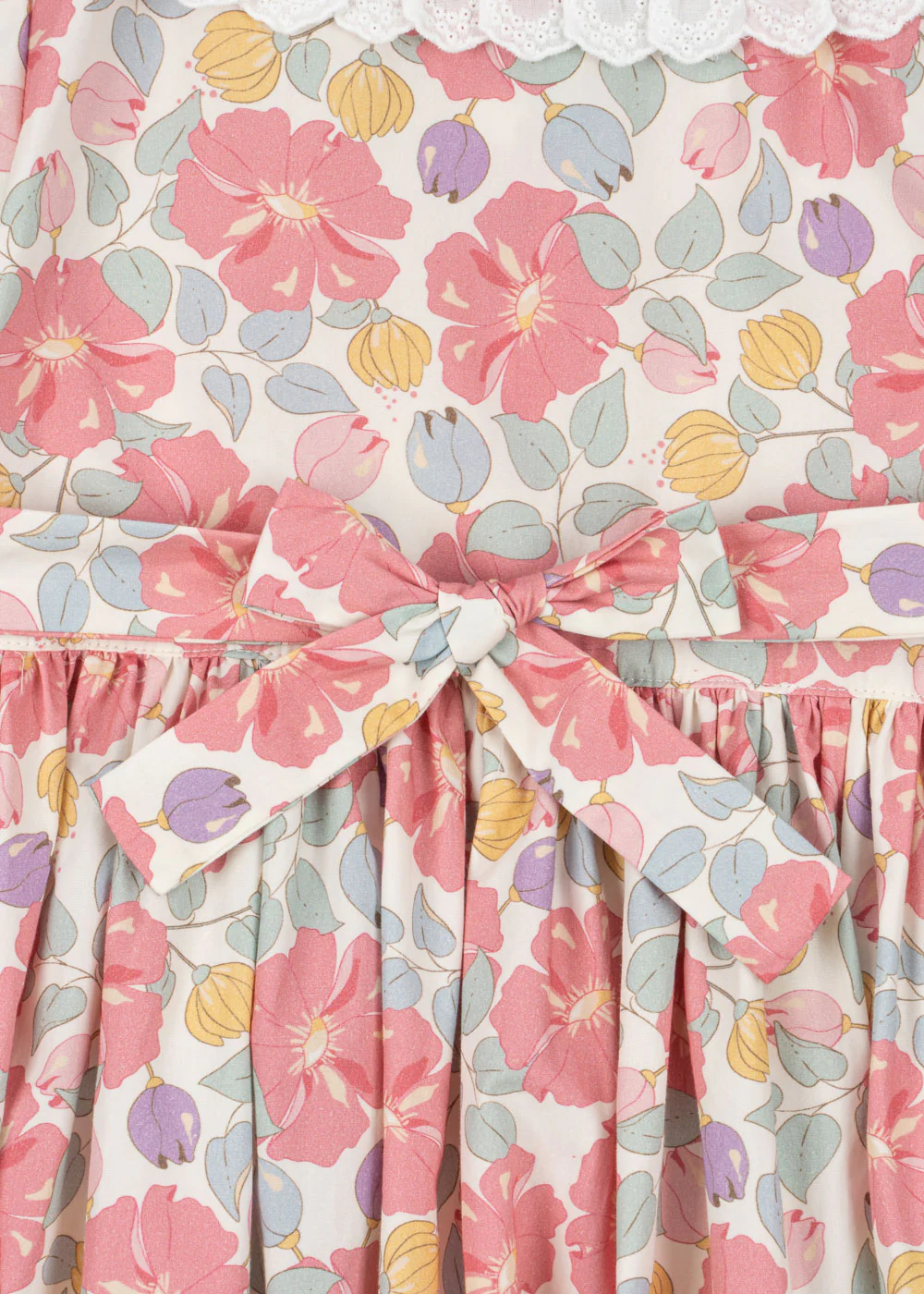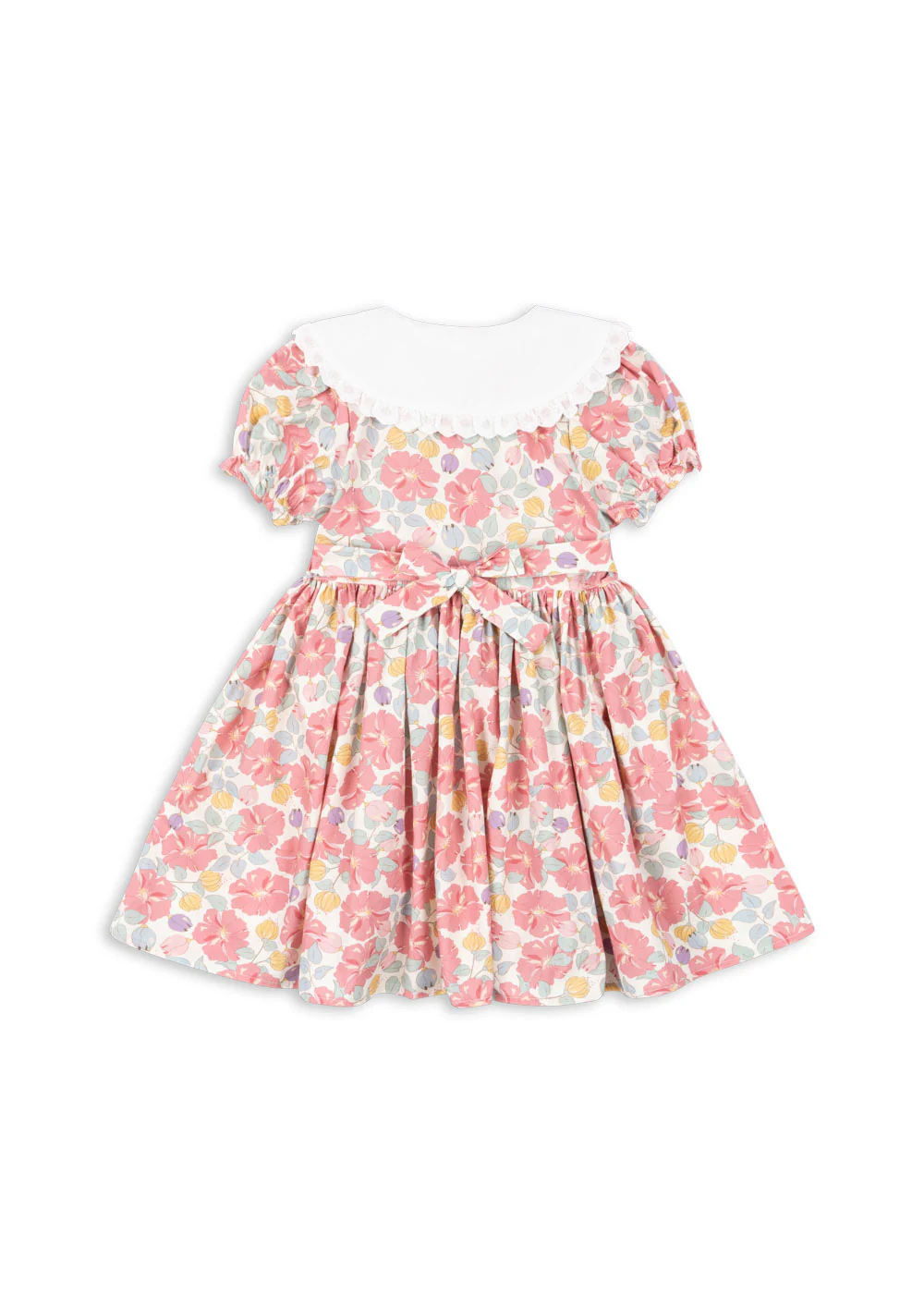 Delikatna sukienka z okrągłym koronkowym kołnierzem i krótkimi bufiastymi rękawami. Zaprojektowana z obitymi materiałem guzikami z przodu i dołączonymi paskami, które wiążą się z tyłu, aby idealnie pasowały.
