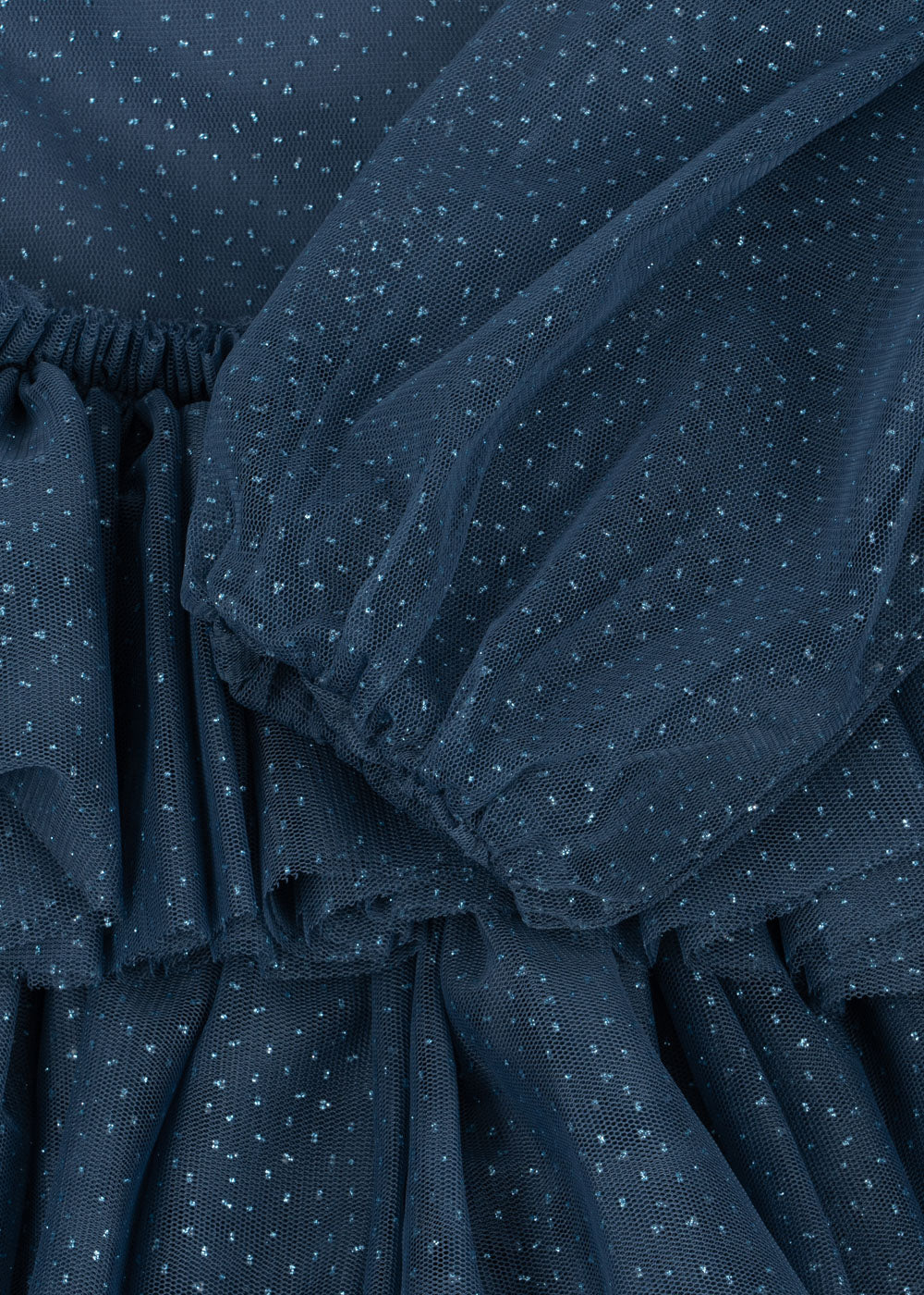Odświętna sukienka z eleganckimi i misternymi zdobieniami. Zaprojektowana z bufiastymi rękawami i szeroką, warstwową spódnicą.