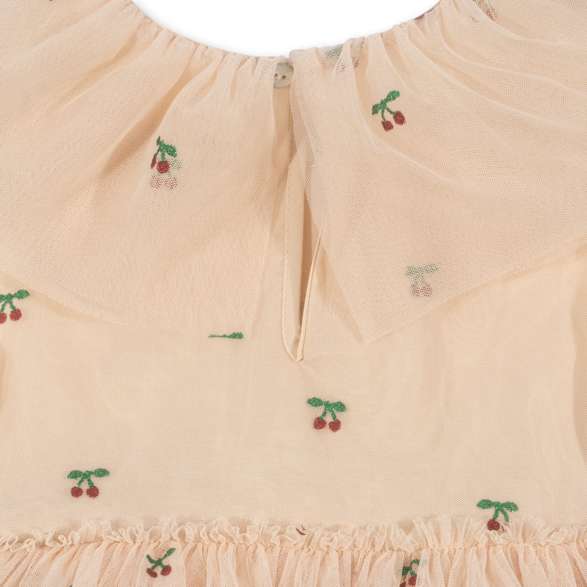 Lekka dwuwarstwowa sukienka z falbanką i dużym, zaokrąglonym kołnierzem. Wykonana z trzech warstw. Wewnętrzna warstwa to miękka bawełna, a dwie zewnętrzne warstwy to lekki tiul. Sukienka zapinana z tyłu na pojedynczy guzik z masy perłowej.