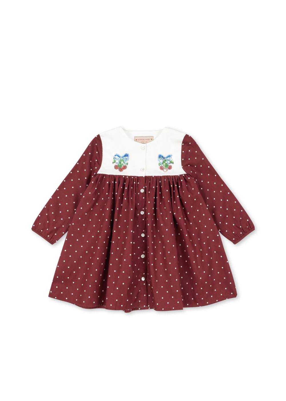 Sukienka z tkaniny bawełnianej, z białym karczkiem i guzikami z masy perłowej.