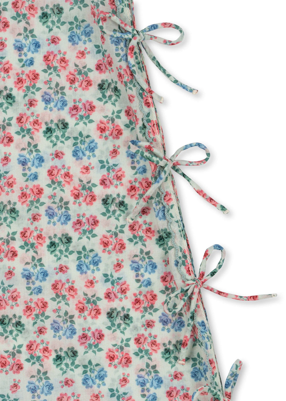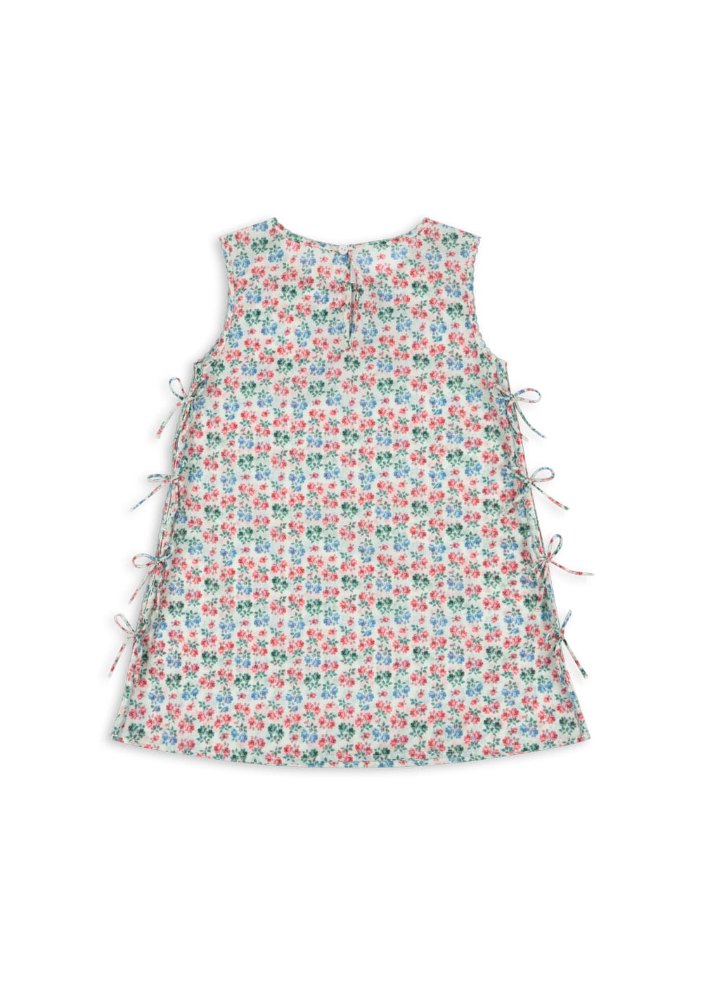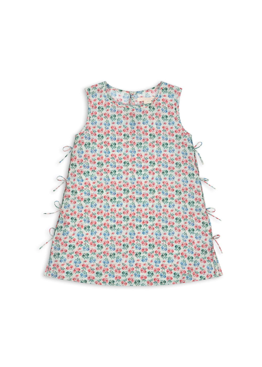 Sukienka bez rękawów z lekkiego i miękkiego bawełnianego woalu. Zaprojektowana w pochlebnej prostej sylwetce z falbaniastymi brzegami i kokardkami po bokach.