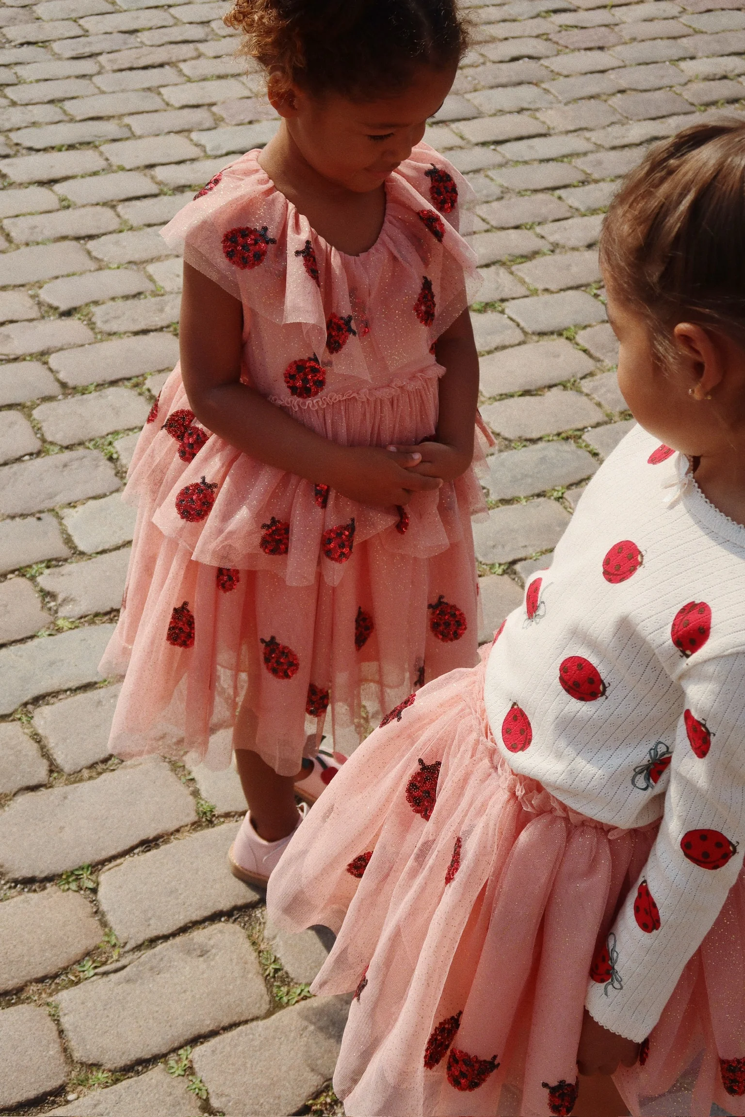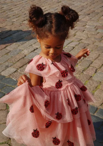 Warstwowa sukienka z obszerną tiulową spódnicą i cekinami w kształcie biedronek, które błyszczą i mienią się.