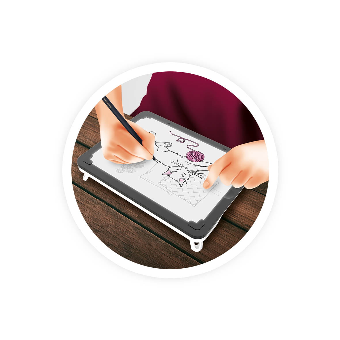 Tablet jest przenośny i może być używany w kilku pozycjach: na płasko z 4 nóżkami, przechylony za pomocą stojaka pośrodku lub położony na kolanach. Format ekranu ma wymiary kartki A5 - 21x14,8 cm.