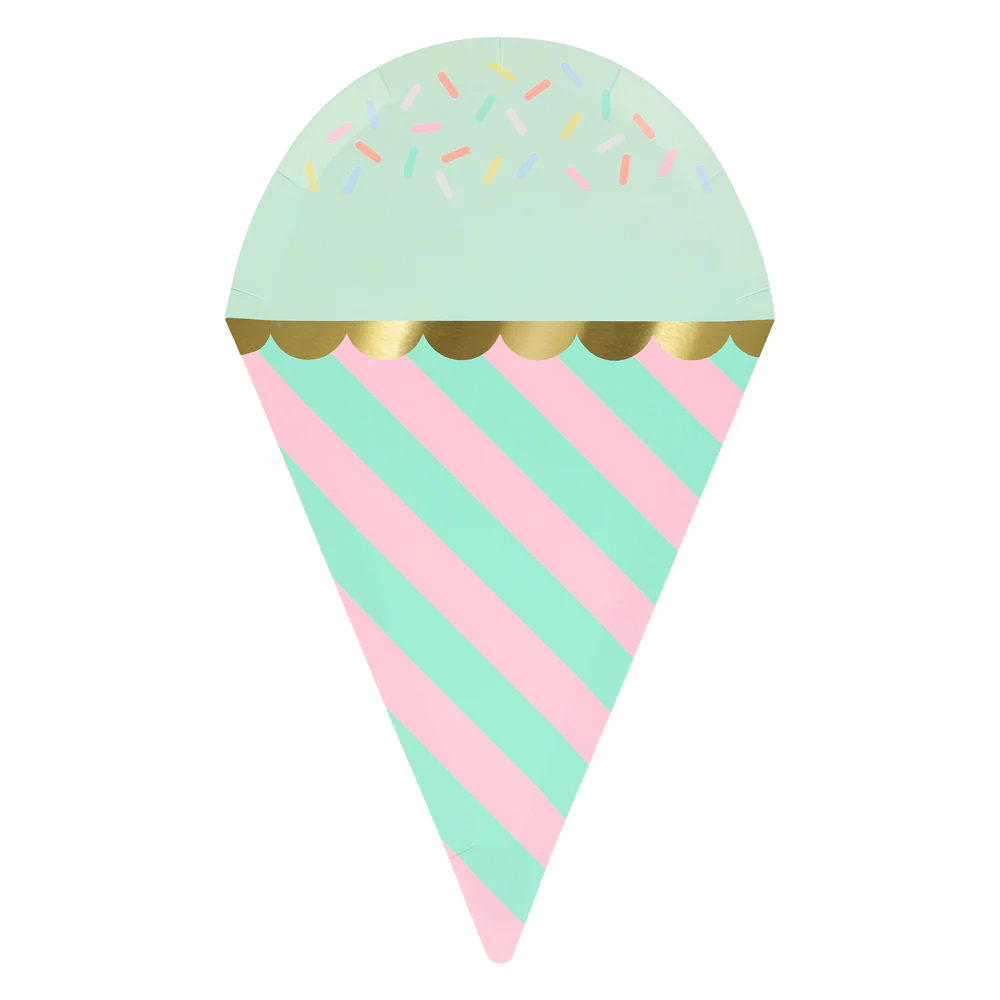 Napełnij swój stół imprezowy beztroskim duchem kalifornijskiego słońca, używając tych zabawnych talerzyków w kształcie rożków do lodów. Dzięki modnym pasiastym wzorom, błyszczącym złotym akcentom foliowym i odrobinie koloru, te papierowe talerzyki wnoszą zabawę i letni styl na każdą okazję. Idealne na wszystko, od przyjęć urodzinowych po grille, pikniki, wieczorki na plaży, spotkania towarzyskie w czasie ferii szkolnych lub spotkania inspirowane karnawałem retro.