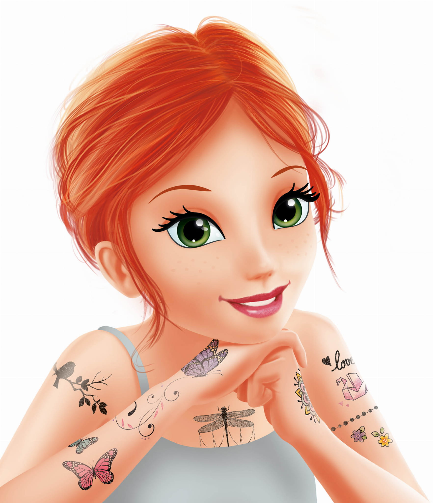 2 arkusze z około 75 zmywalnymi, brokatowymi tatuażami z motywami roślin, serc czy motyli. Wytnij wybrany tatuaż, oderwij folię zabezpieczającą i przyłóż do skóry. Zwilż wodą i poczekaj aż tatuaż odbije się na skórze.