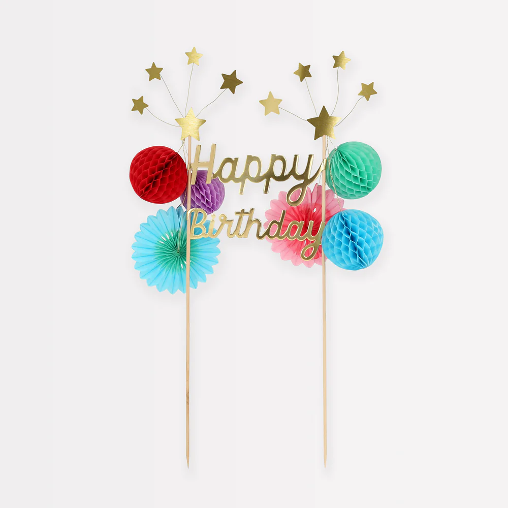 Topper z napisem, złotymi gwiazdkami z folii i pomponami z papieru nadają tej urodzinowej ozdobie na tort fantastyczny efekt 3D. Gwarantujemy, że Twój tort imprezowy będzie wyglądał niesamowicie w kilka sekund!