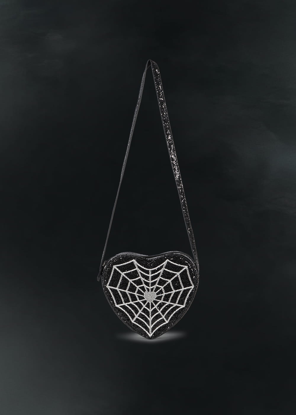 Błyszcząca mała Tut to klasyczna torba na ramię z cienkim paskiem na ramię. Specjalnie na Halloween ozdobiona została brokatem i pajęczą siecią z przodu.