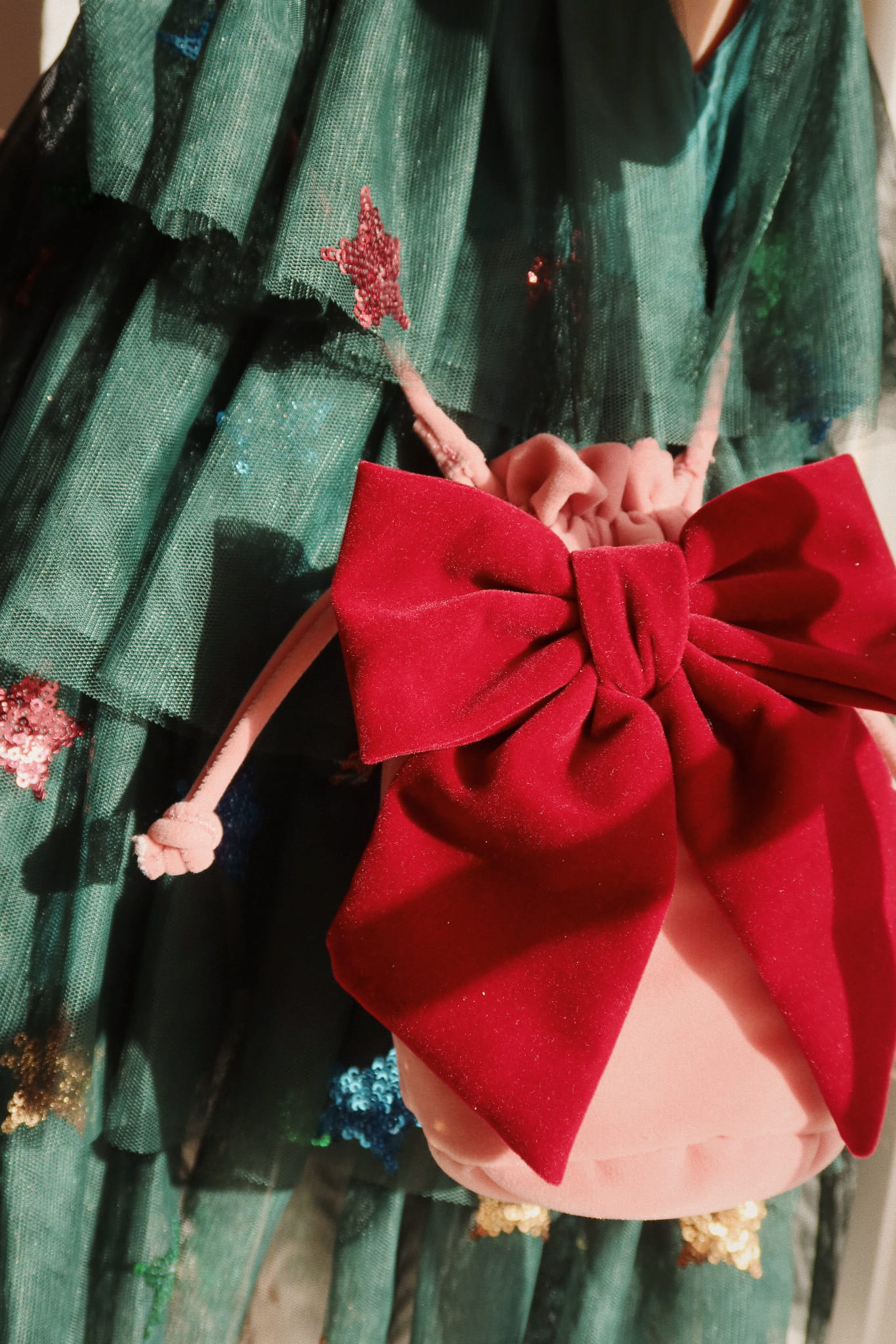 Miękka, mała torebka ze ściągaczem i dużą kokardą.