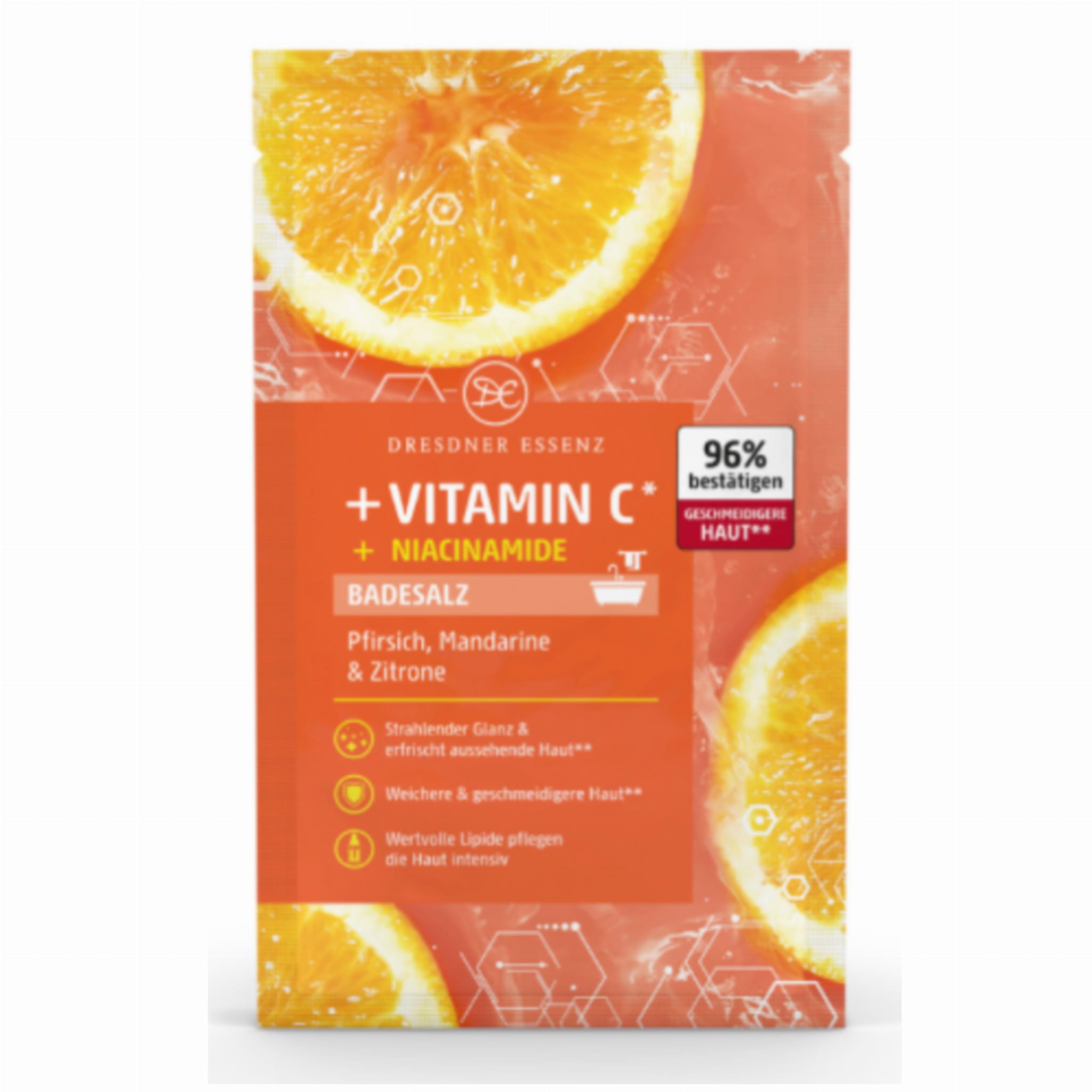 Aktywna sól do kąpieli Dresdner Essenz z WITAMINĄ C* I NIACYNAMIDAMI działa rewitalizująco i pobudzająco na ciało i umysł dzięki naturalnym olejkom eterycznym z mandarynki i cytryny, połączonym z orzeźwiającym zapachem z nutą brzoskwini. Sól do kąpieli wzbogacona jest cennymi składnikami aktywnymi, takimi jak witamina C* i niacynamidy, dzięki czemu zapewnia promienny blask i świeży wygląd skóry. Intensywny kompleks pielęgnacyjny z cennymi lipidami, witaminą C* i niacynamidami odżywia skórę i pomaga chronić ją przed wysuszeniem.