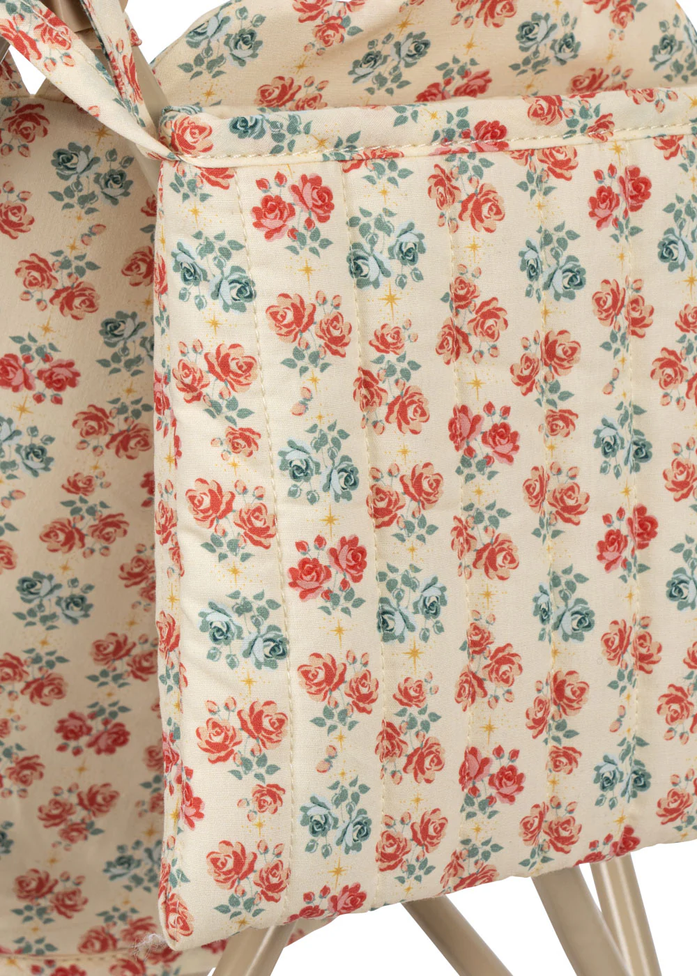 Wózek dla lalek wyposażony w szelki, torbę transportową i podwójne koła na wszystkich czterech nogach dla dodatkowej stabilności. Posiada zdejmowaną tapicerkę. Jest w pełni zmontowany i łatwy do złożenia i przechowywania.