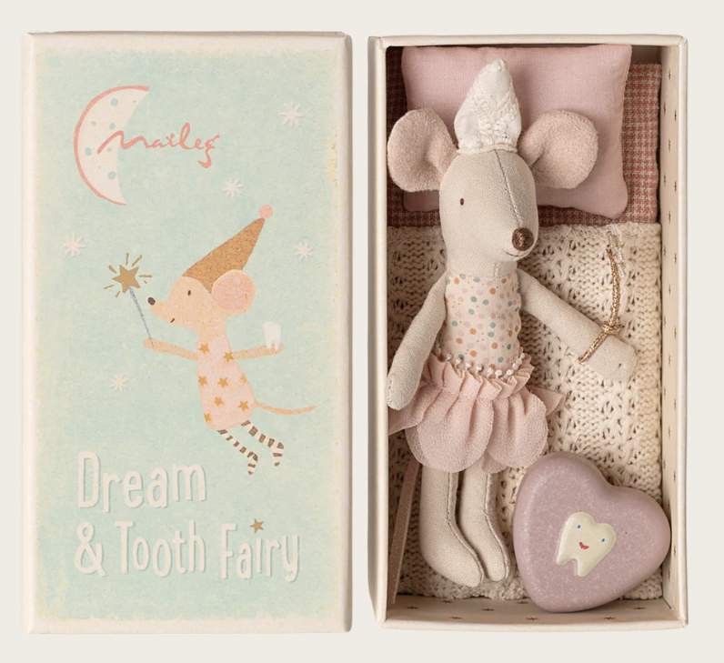 W nocy Wróżka Zębuszka rozsiewa magiczny pył, zbiera zęby, przynosi smakołyki i dba o słodkie sny. Ubrana w magiczny strój, śpi twardo w miękkiej pościeli – w zestawie pudełko na zęby i pudełko zapałek.