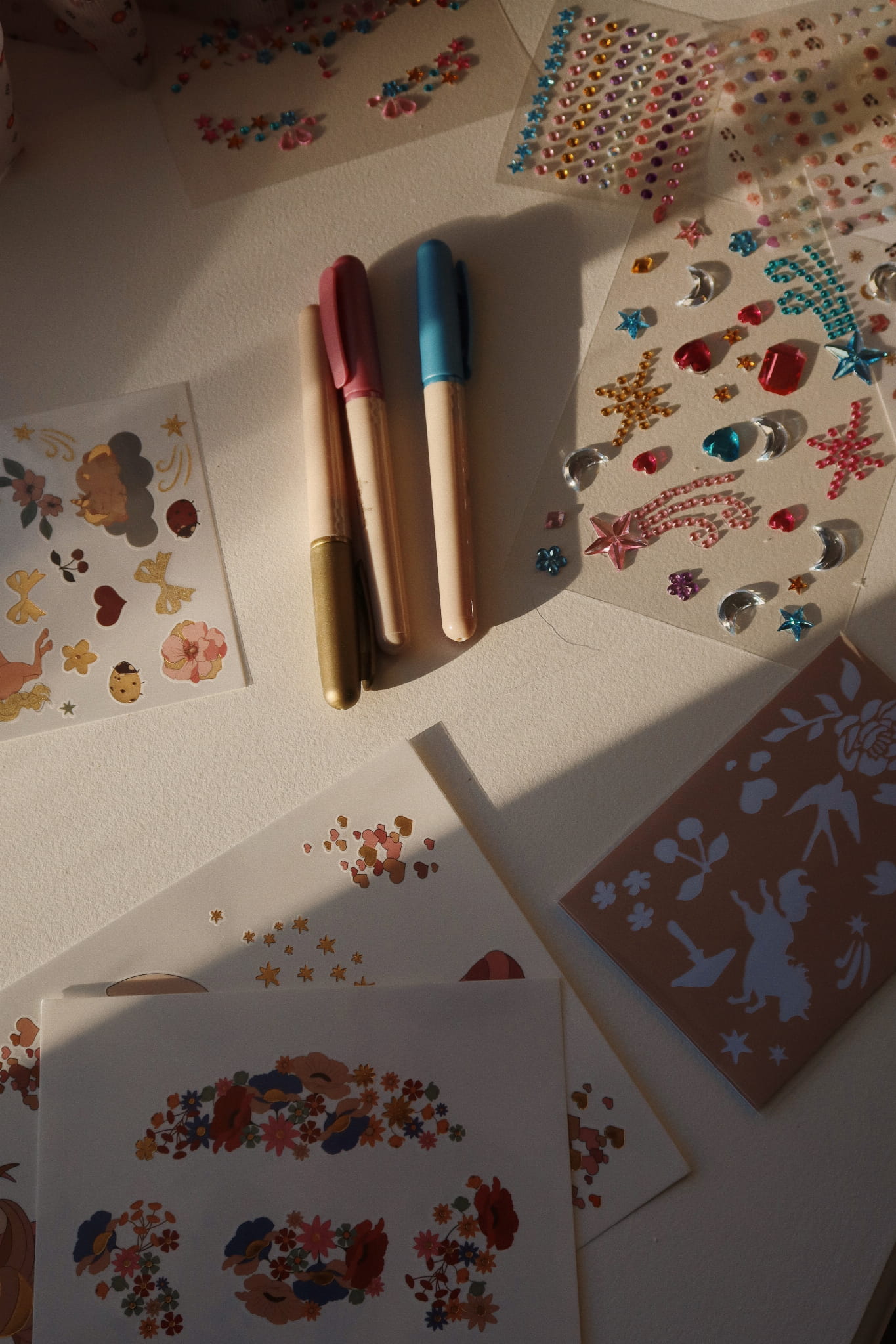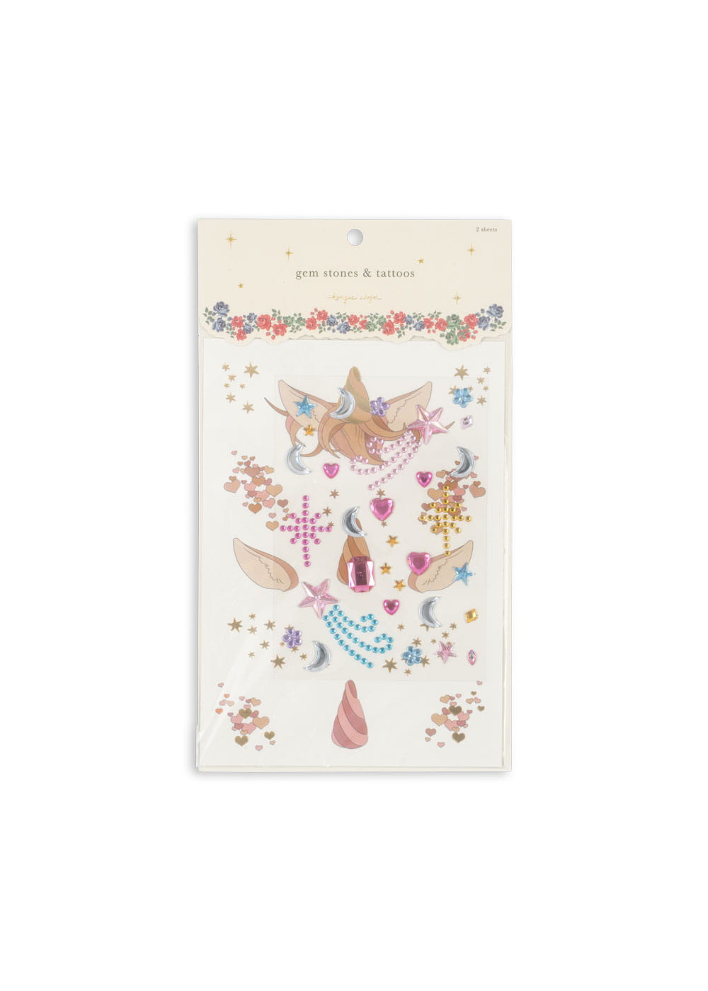 Zawiera jeden arkusz tatuaży i jeden arkusz małych klejnocików do kreatywnej zabawy.