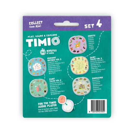 TIMIO Zestaw dysków 4. Znajdziecie w nim: - Rymowanki cz. 3, Bajki cz. 2, Bajki cz. 3.,Małe owady, Dinozaury. Jest to rozszerzenie zestawu startowego o 5 dodatkowych dysków, przeznaczone do użytku z interaktywną zabawką edukacyjną TIMIO (sprzedawaną oddzielnie). Pięknie ilustrowane dyski są magnetyczne i mogą być łatwo wymieniane przez dziecko. Z quizami i prawdziwymi dźwiękami dla większej interakcji zapewniają dziecku łatwiejszą naukę i więcej przyjemności z zabawy. Zawartość audio to ok. 160 minut dla każdego języka lub 21 godzin we wszystkich językach. Zestaw zapakowany w kartonowe pudełko.