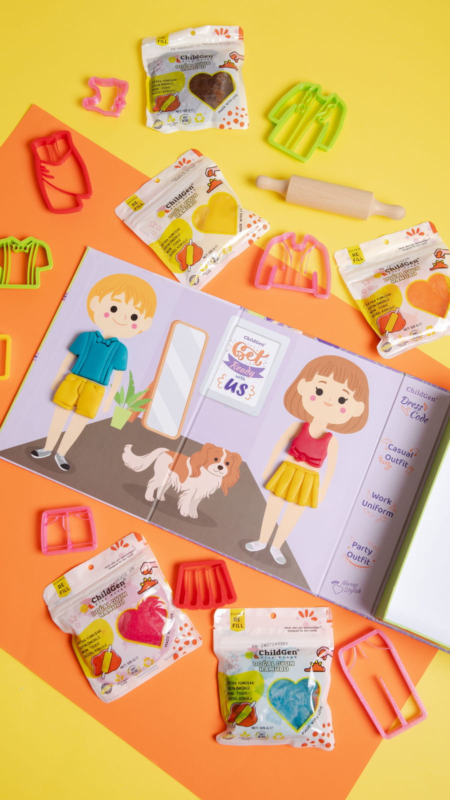Ten unikalny zestaw zabawy z ciastoliną pozwala dzieciom poczuć się jak prawdziwi projektanci mody. Na okładkach pudełka czekają dwie wspaniałe aktywności – na jednej z nich dzieci mogą ozdobić twarze postaci, tworząc fantazyjne fryzury, dodając akcesoria takie jak spinki czy kolczyki, a na drugiej – mogą zaprojektować stroje dla chłopca i dziewczynki, wykorzystując ciastolinę oraz specjalne foremki do tworzenia ubrań.