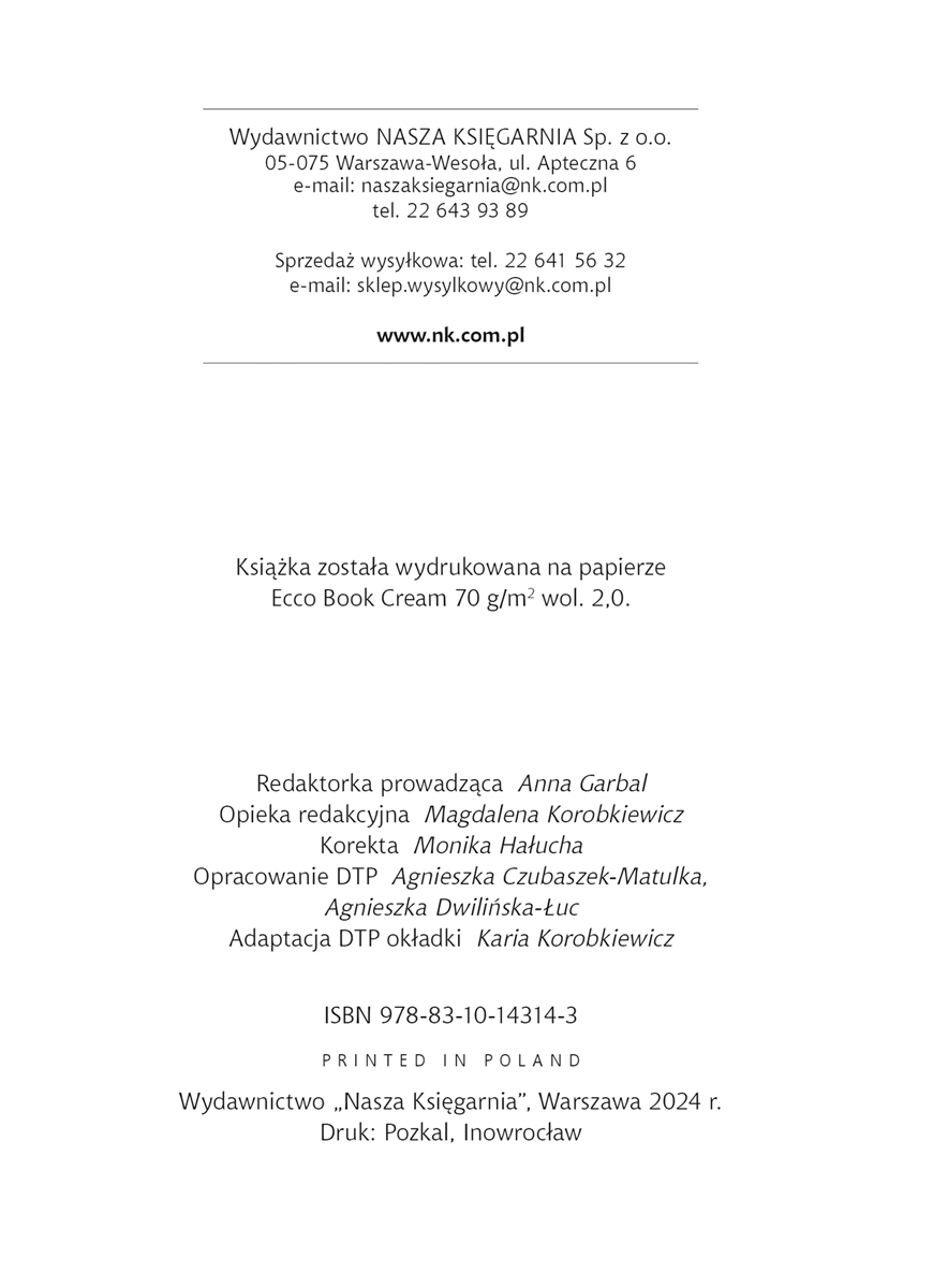 NASZA KSIĘGARNIA to jedno z najstarszych wydawnictw w Polsce. Powstało w 1921 roku i łączy w sobie tradycję i nowoczesność. Posiada wyłączne prawa do publikacji takich bestsellerów światowych, jak książki Astrid Lindgren, 9-tomowy cykl o Muminkach Tove Jansson, „Kubuś Puchatek” i „Chatka Puchatka” A.A. Milne´a z oryginalnymi ilustracjami Ernesta Sheparda, cykl o Mikołajku znakomitej spółki autorsko-ilustratorskiej Sempé i Goscinnego. Przybliża polskim czytelnikom najciekawsze pozycje literackie dla dzieci, młodzieży i dorosłych.